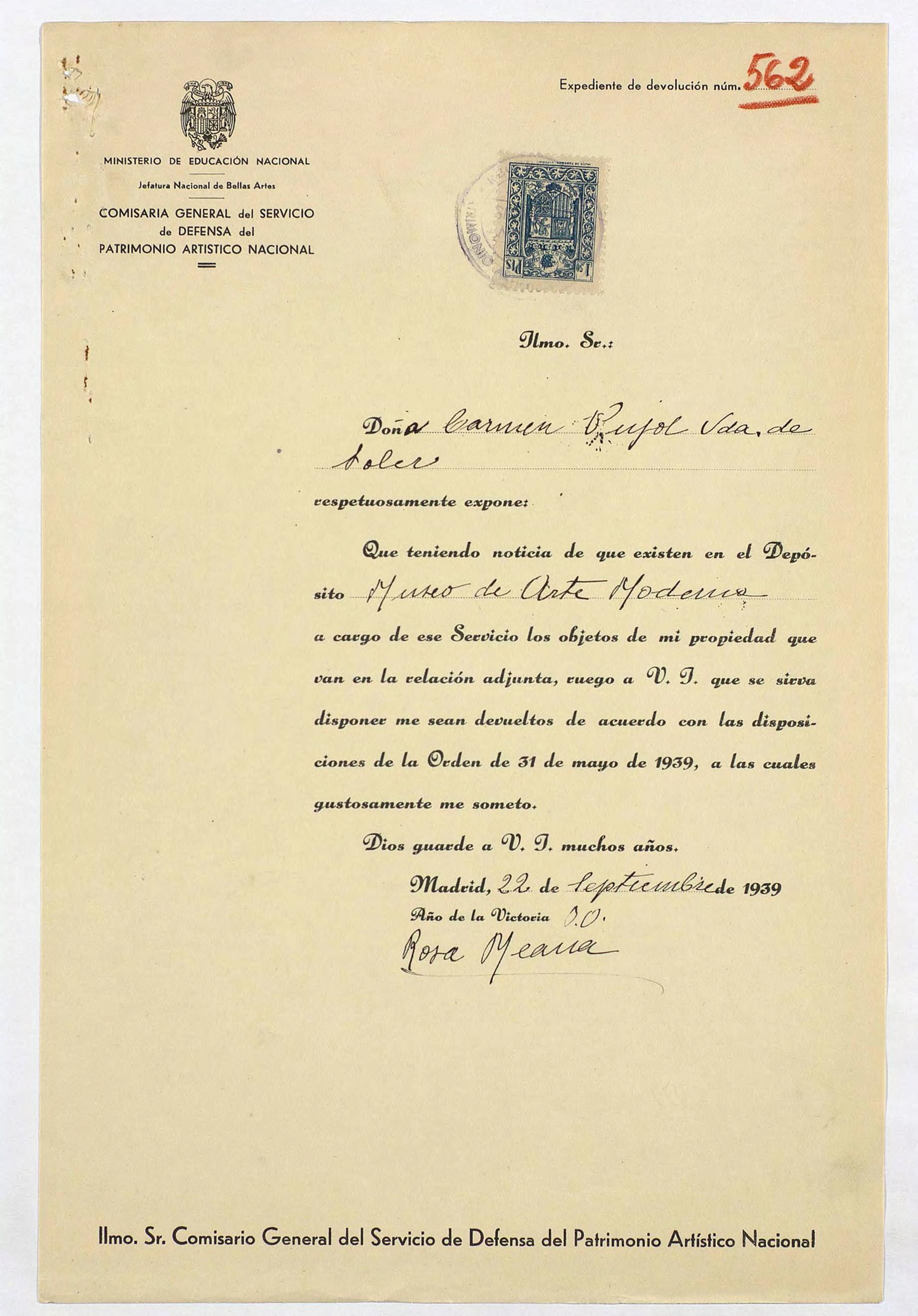 Expediente de devolución de Carmen Pujol, viuda de Soler