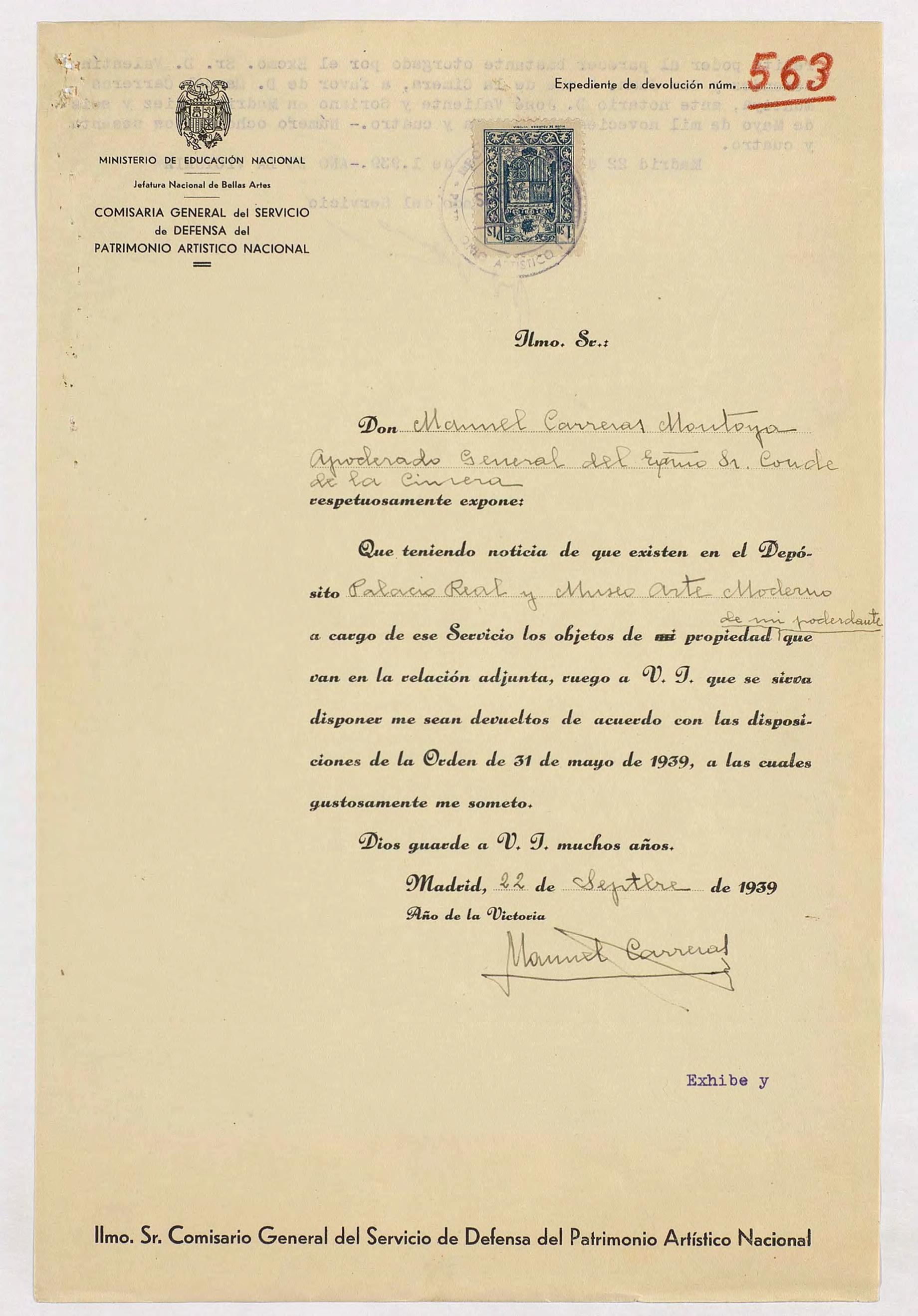 Expediente de devolución de Valentín Menéndez y San Juan, conde de la Cimera