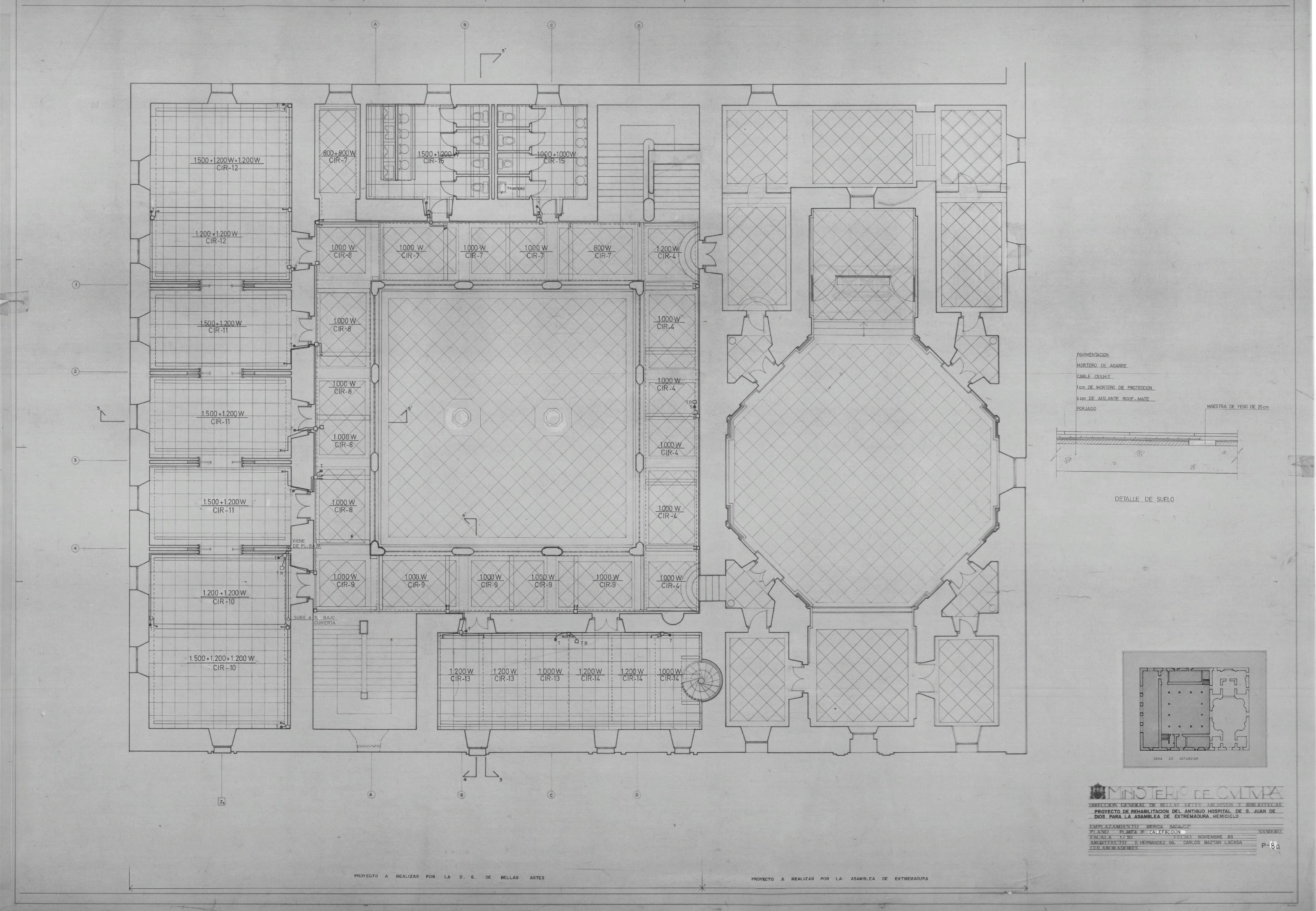 ASAMBLEA DE EXTREMADURA PROYECTO DE REHABILITACIÓN DEL ANTIGUO HOSPITAL DE S. JUAN DE DIOS PARA SEDE DE LA ASAMBLEA: PLANTA PRIMERA GENERAL CALEFACCION Figura en sello "HEMICICLO" Sobre copia de p. 1ª pavimentación Con especificación en cada estancia . Especifica zona de proyecto correspondiente a D.G.B.B.A.A. Y a la Asamblea de Extremadura. Con Detalle de Suelo. Sin firmar