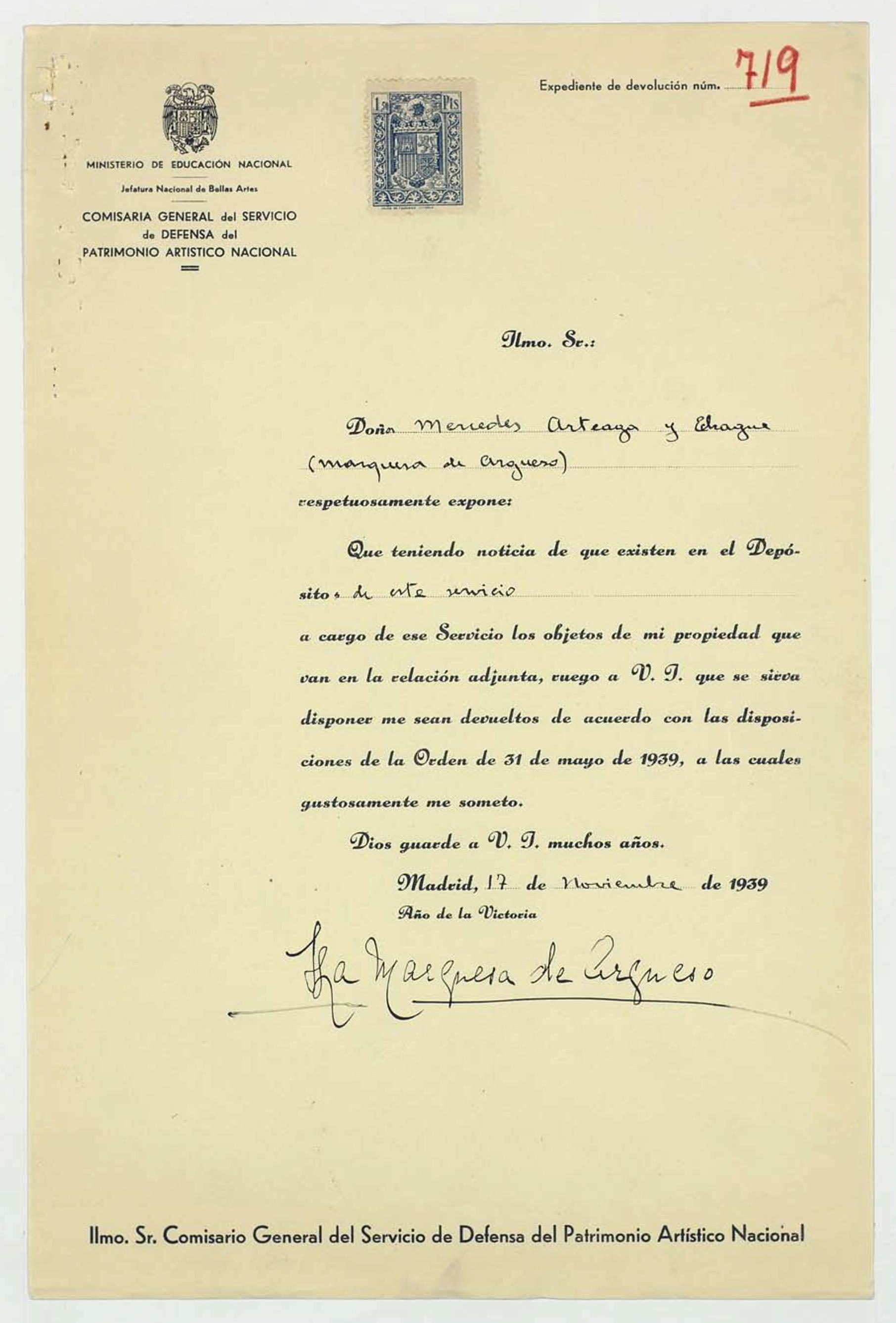 Expediente de devolución de Mercedes Arteaga y Echagüe, (marquesa de Argüeso)
