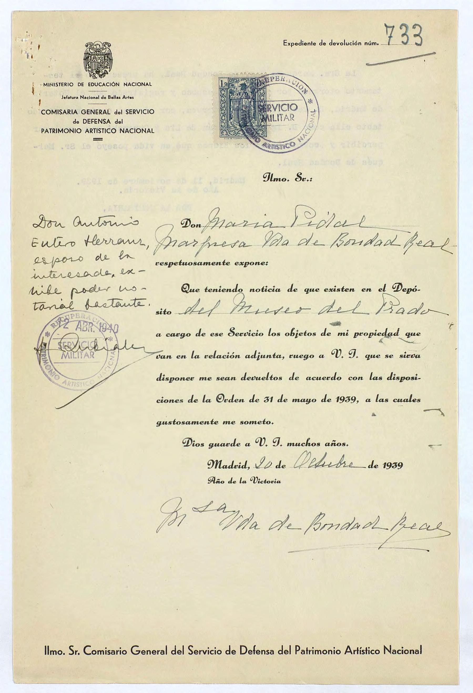 Expediente de devolución de María Pidal, marquesa viuda de Bondad Real