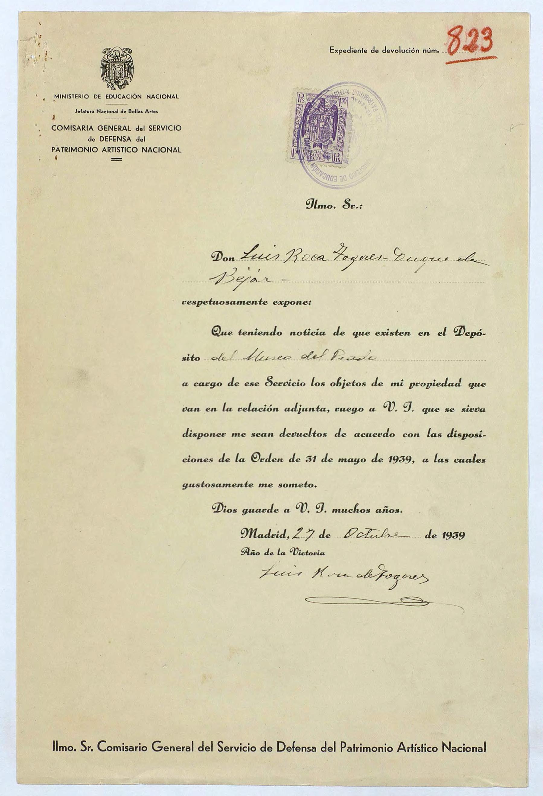 Expediente de devolución de Luis Roca de Togores, duque de Béjar