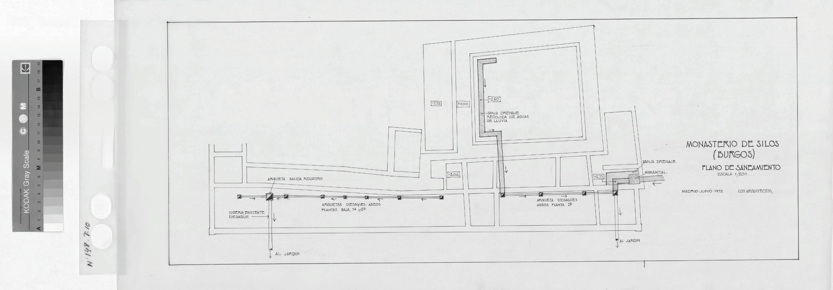 MONASTERIO DE SILOS. -BURGOS-: PLANO DE SANEAMIENTO , Detalle de saneamiento con arquetas, zanjas y desagues ; cotas de alturas en algunas dependencias.