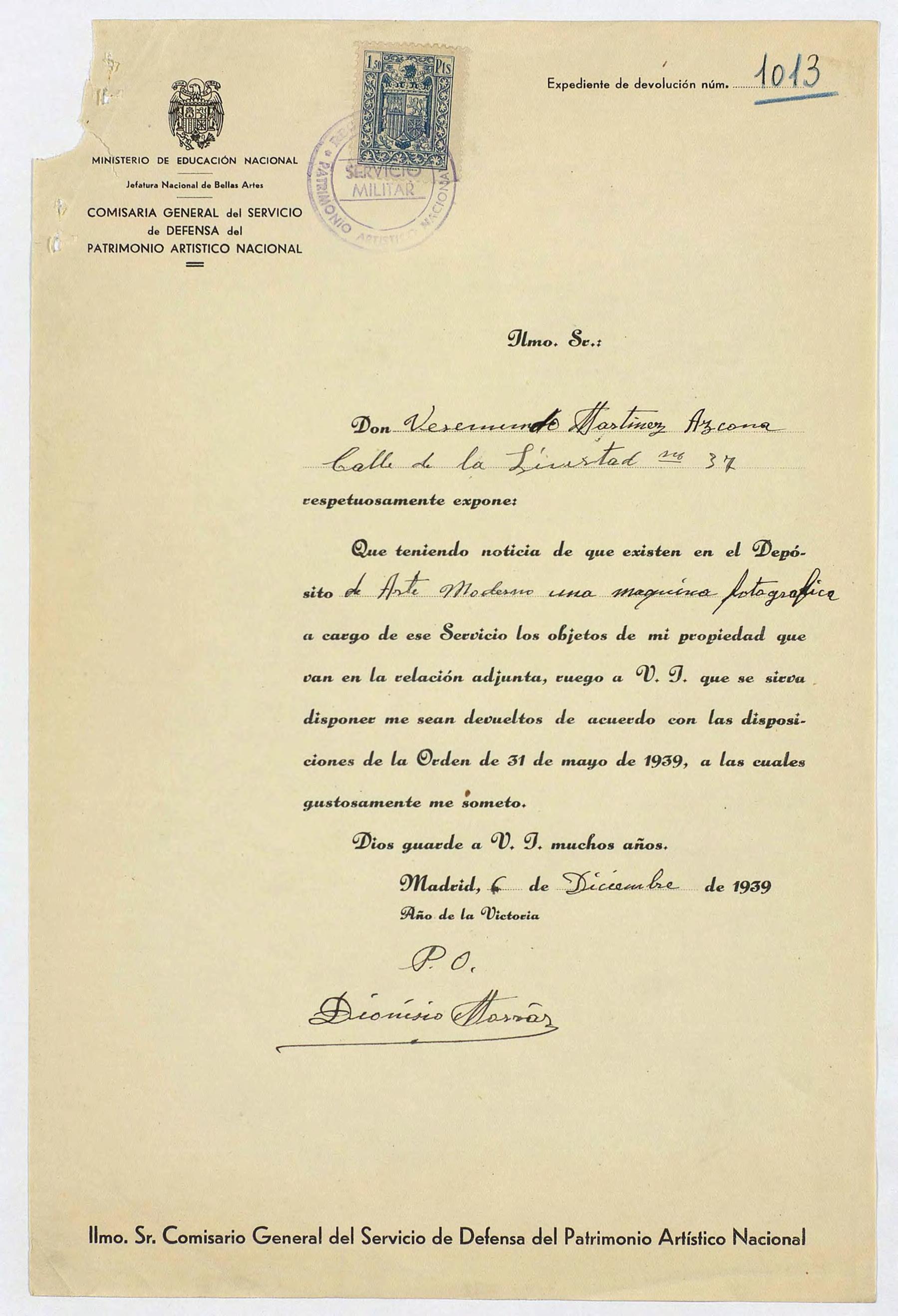 Expediente de devolución de Veremundo Martínez Azcona
