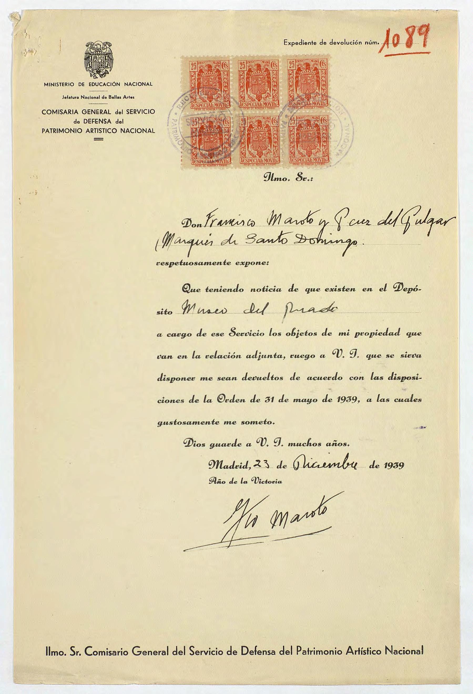 Expediente de devolución de Francisco Maroto y Pérez del Pulgar, marqués de Santo Domingo