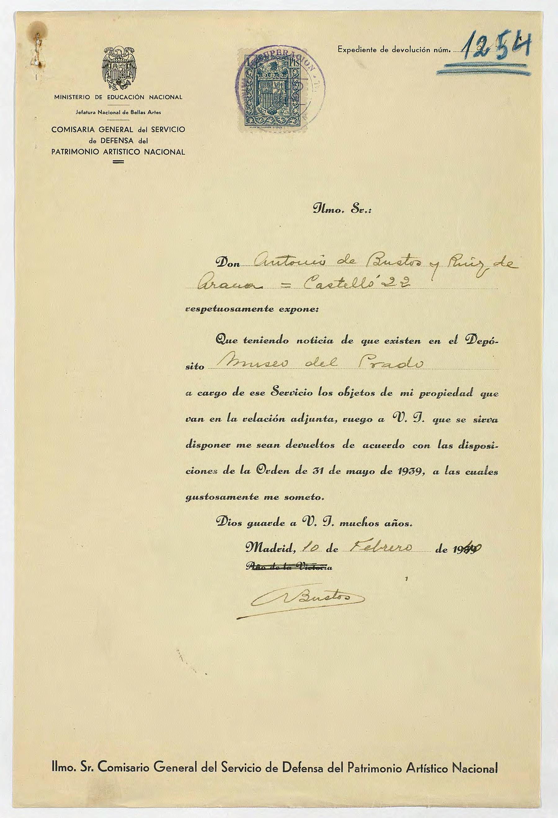 Expediente de devolución de Antonio de Bustos y Ruiz de Arana