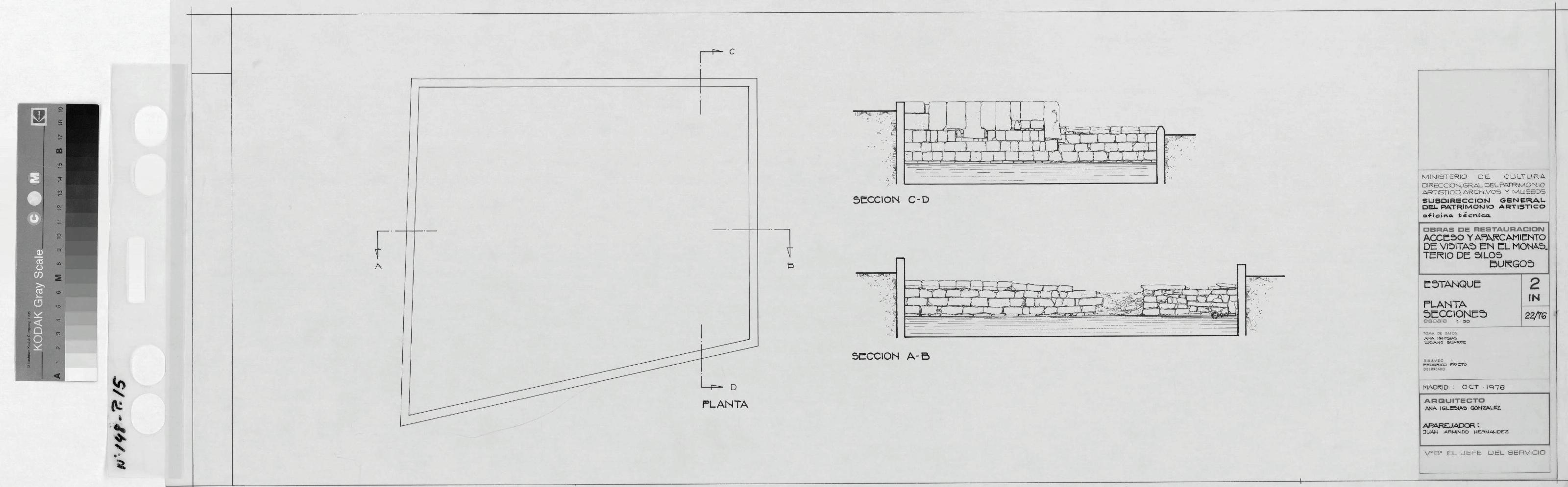 MONASTERIO DE SILOS. -BURGOS - ACCESO Y APARCAMIENTO: ESTANQUE, PLANTA Y SECCIONES. Planta del estanque y dos secciones, planos sin acotar