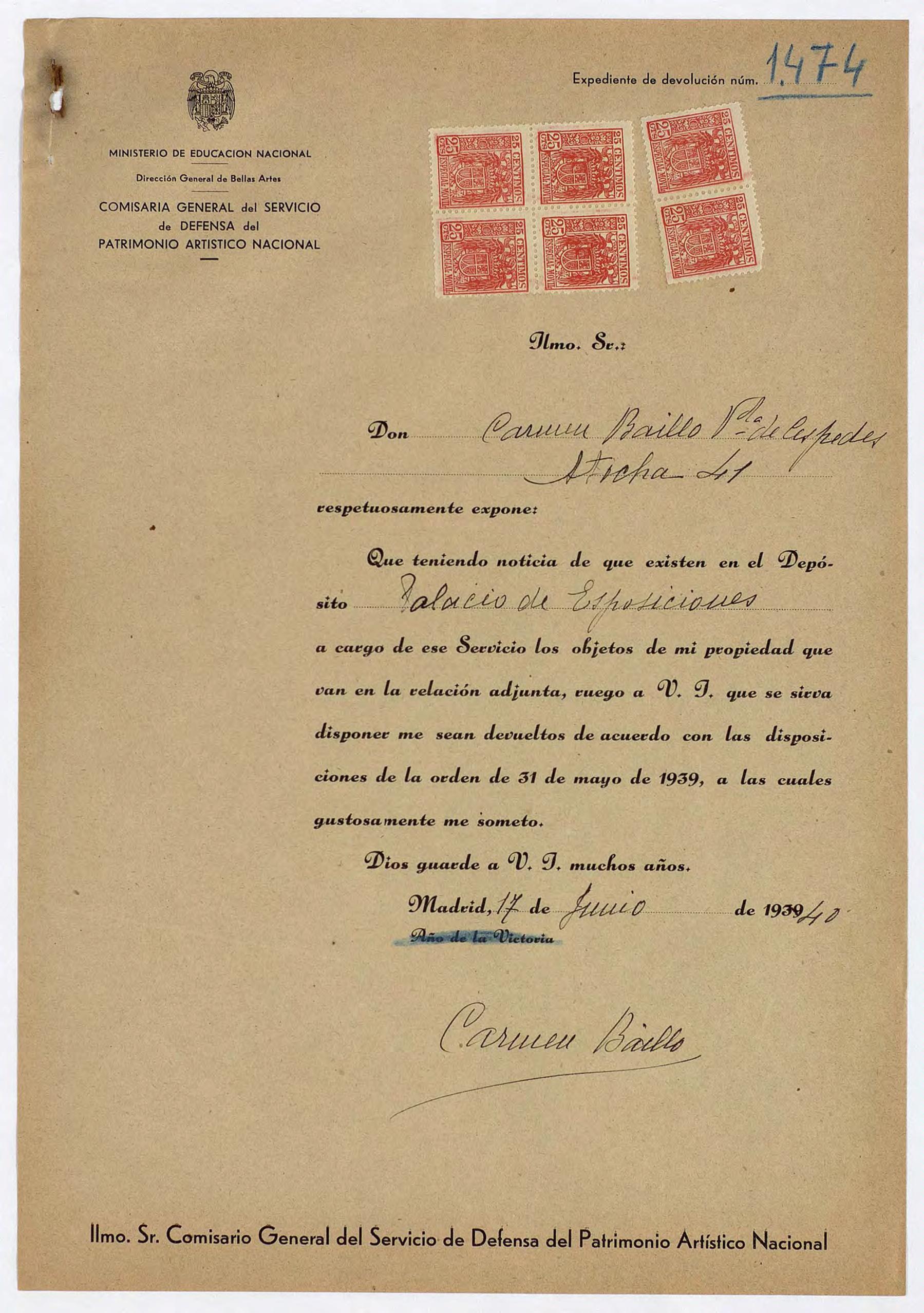 Expediente de devolución de Carmen Baillo, viuda de Céspedes