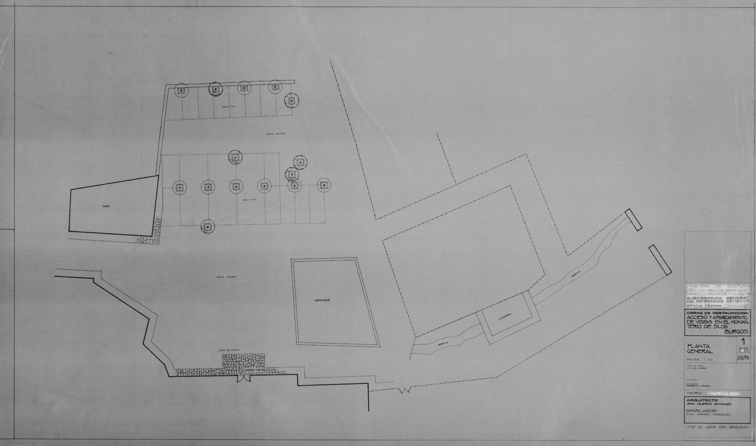 MONASTERIO DE SILOS. -BURGOS- ACCESO Y APARCAMIENTO.: PLANTA GENERAL. Plano de situacion y emplazamiento del entorno al monasterio, nos marca la pavimentacion de la calle, la entrada al recinto y alrededores. Plano sin cotas.