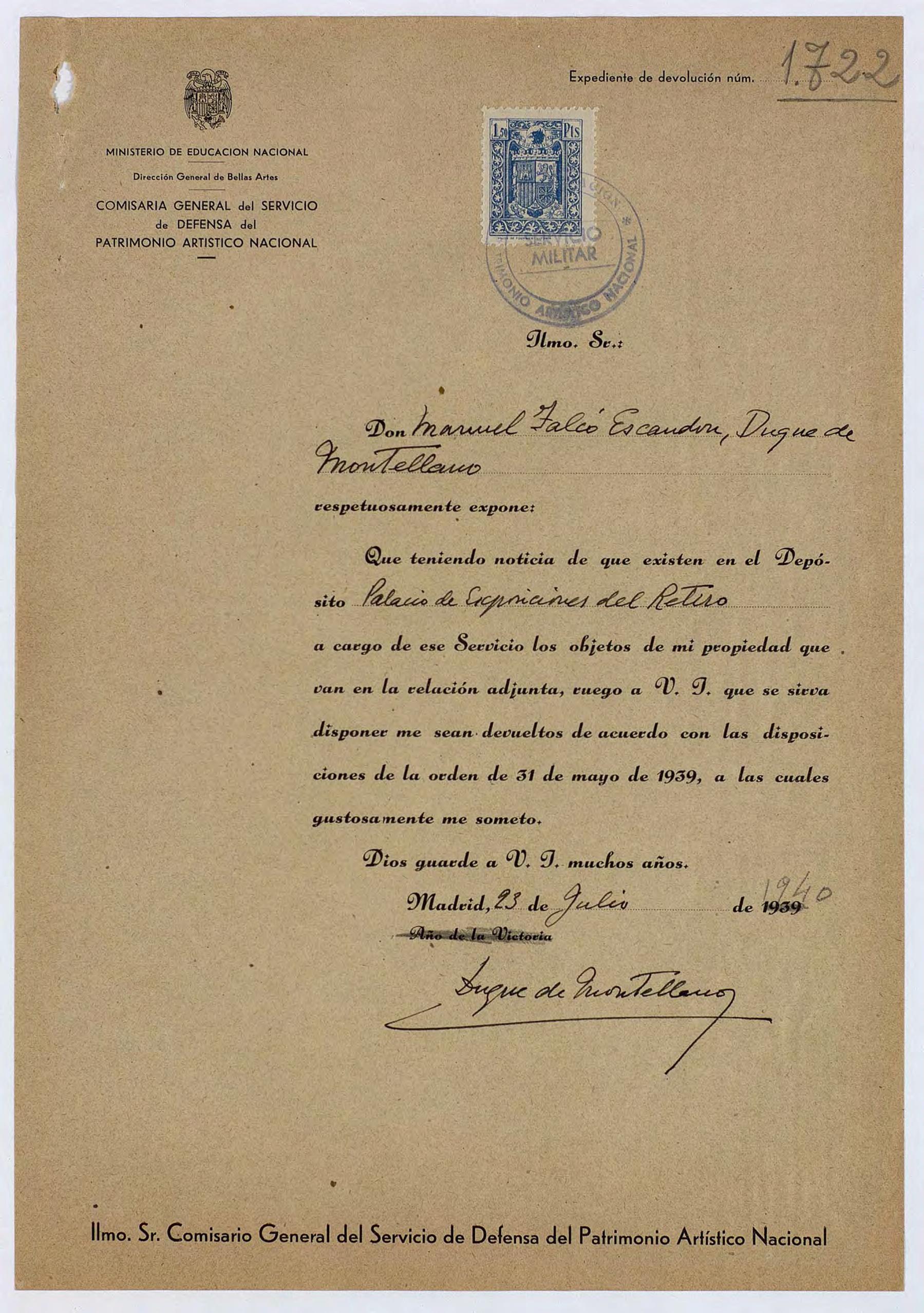 Expediente de devolución de Manuel Falcó Escandón, duque de Montellano