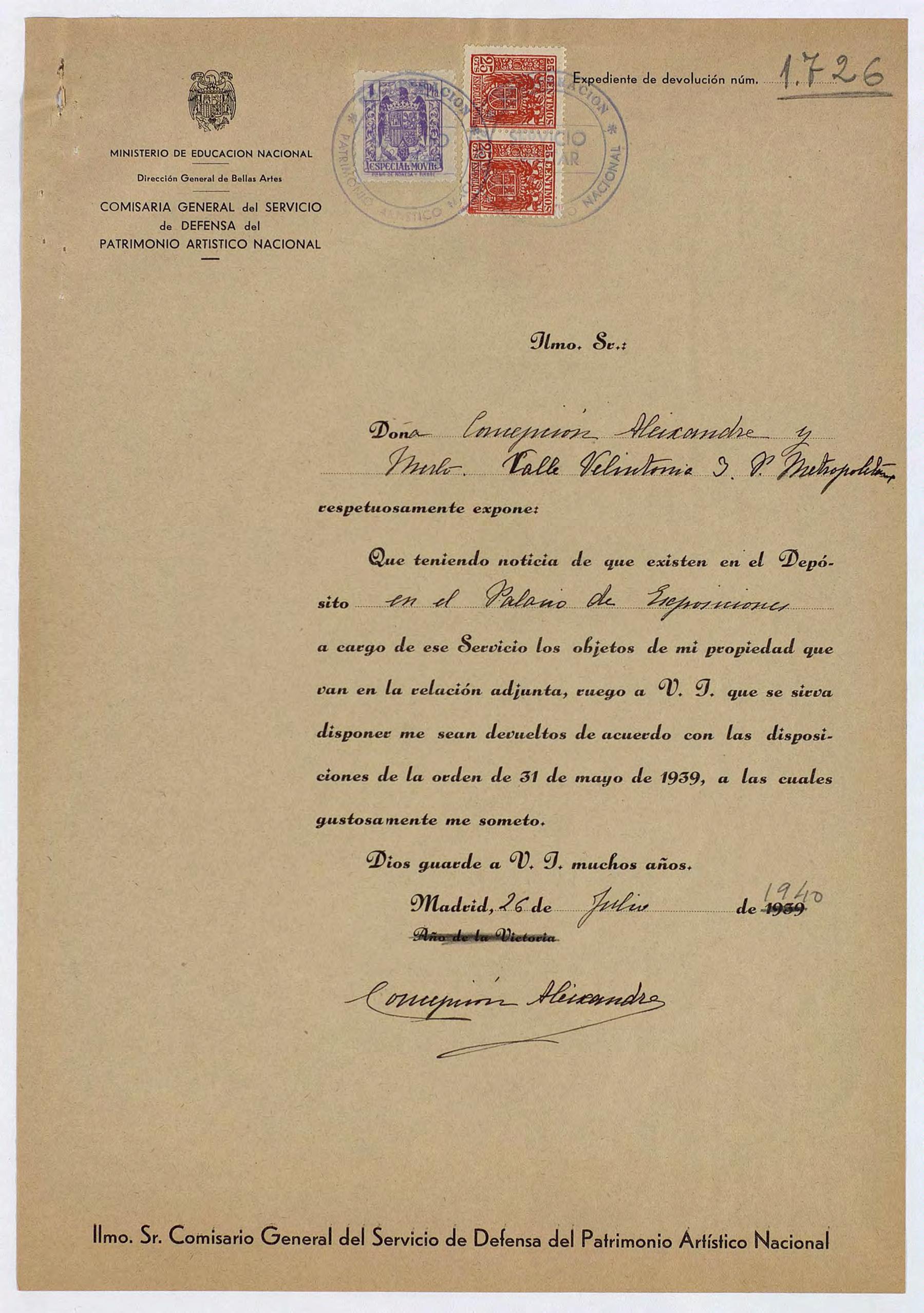 Expediente de devolución de Concepción Aleixandre y Merlo
