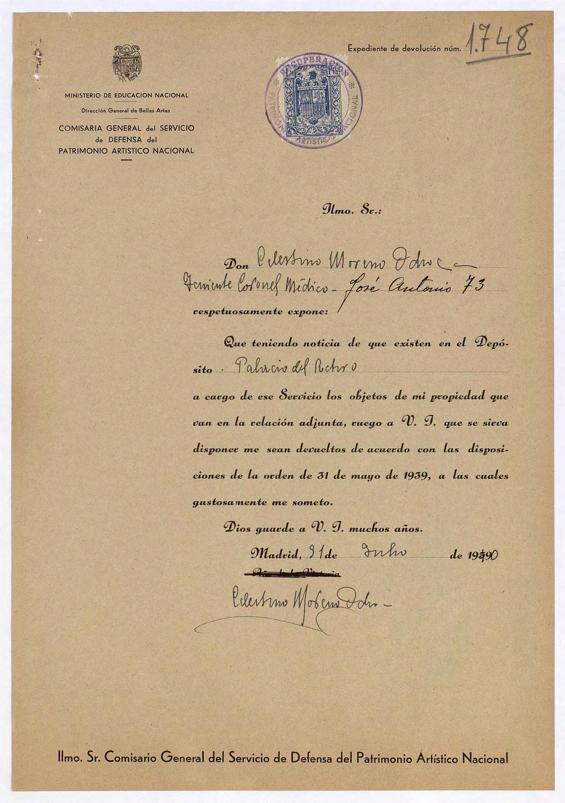 Expediente de devolución de Celestino Moreno Ochoa