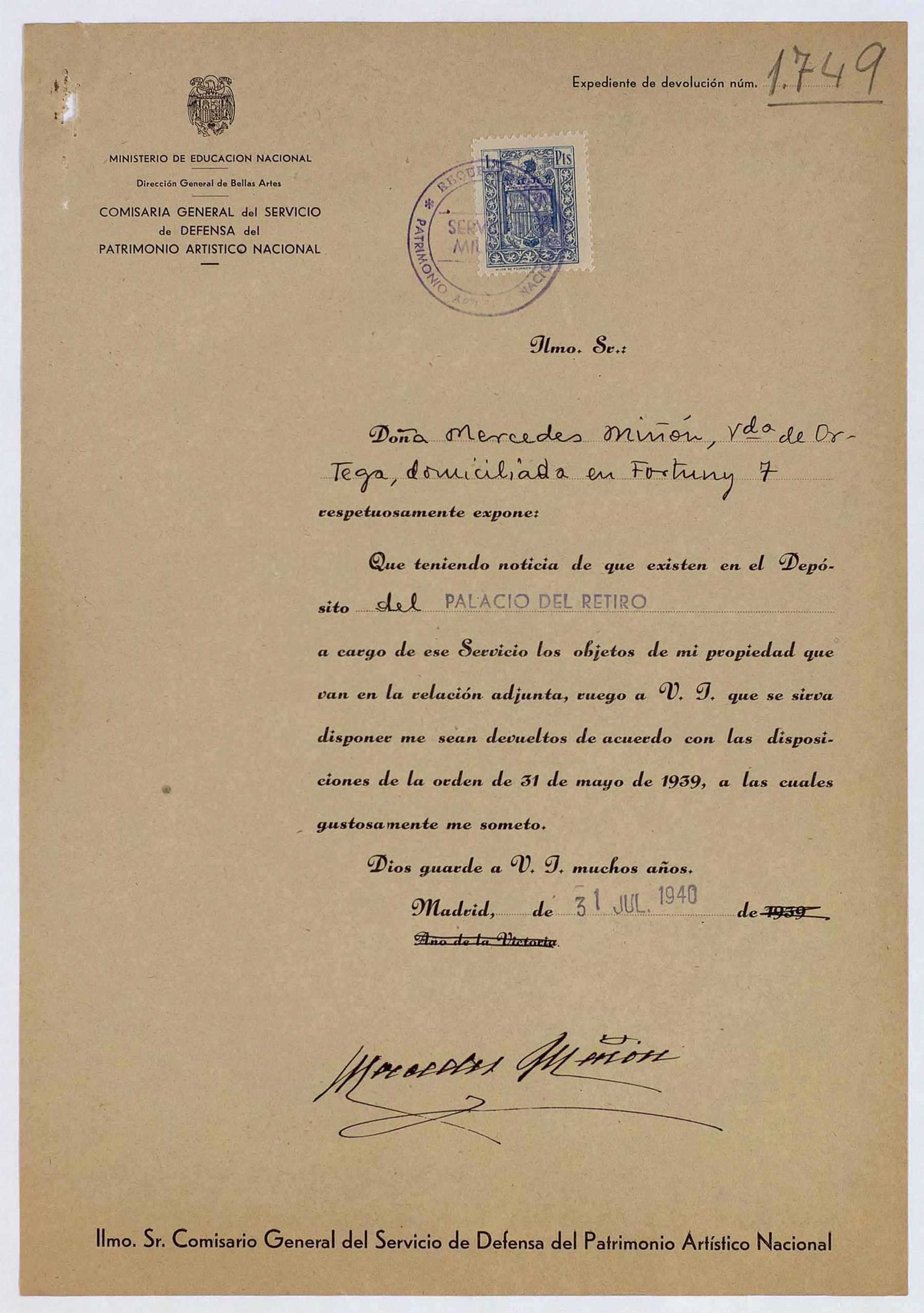 Expediente de devolución de Mercedes Miñón, viuda de Ortega