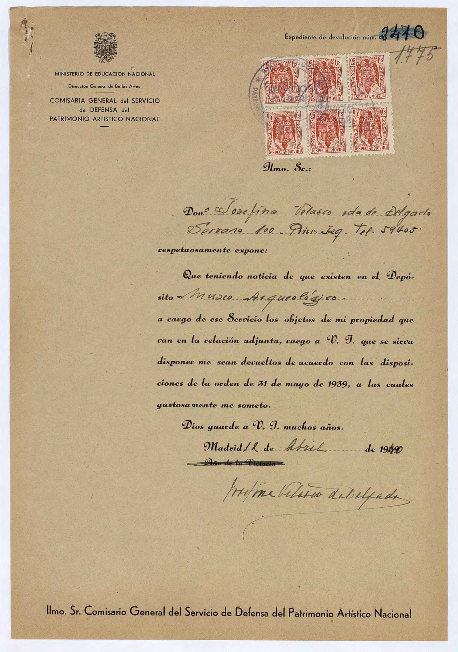 Expediente de devolución de Josefina Velasco, viuda de Delgado