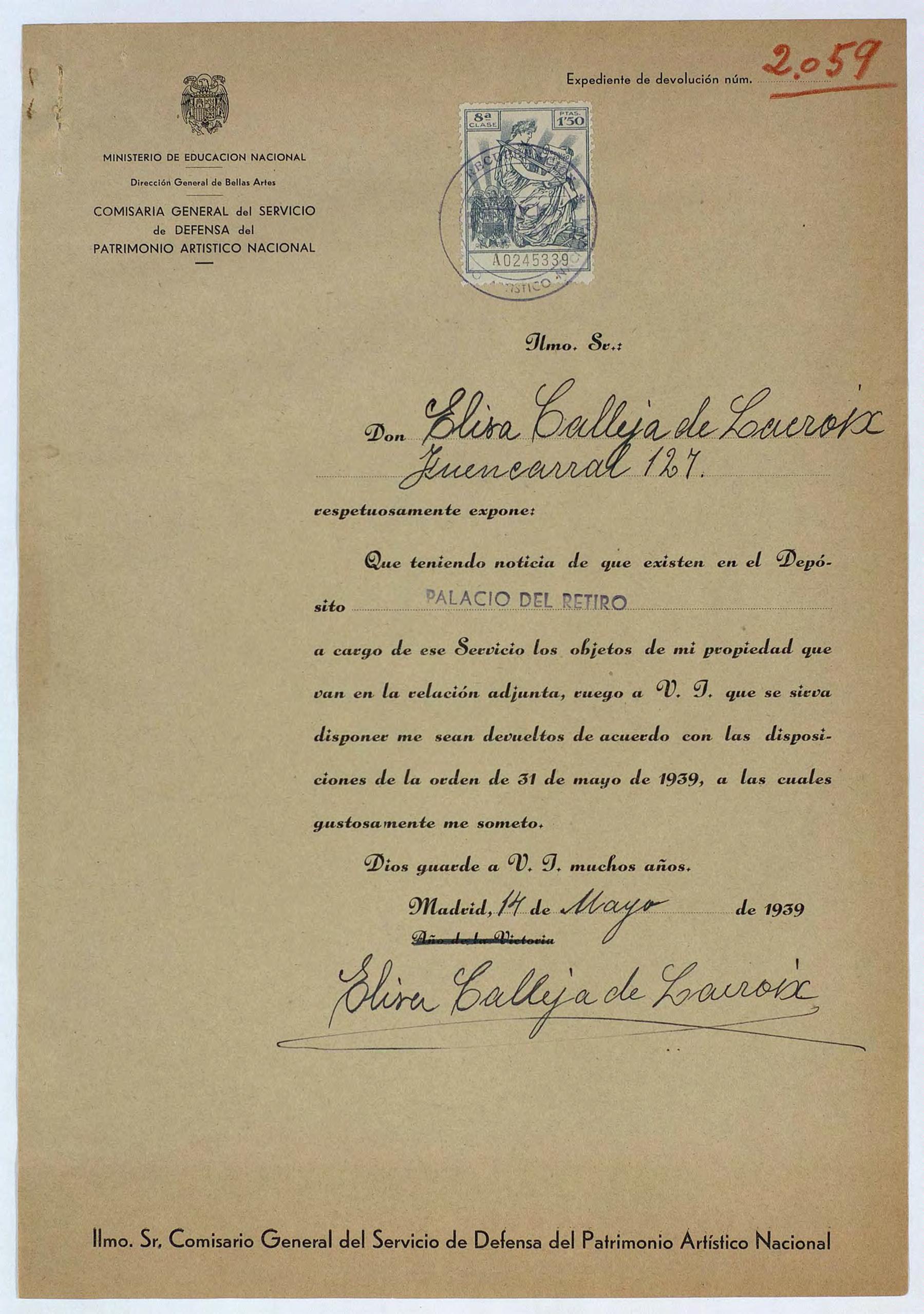 Expediente de devolución de Elisa Calleja de Lacroix