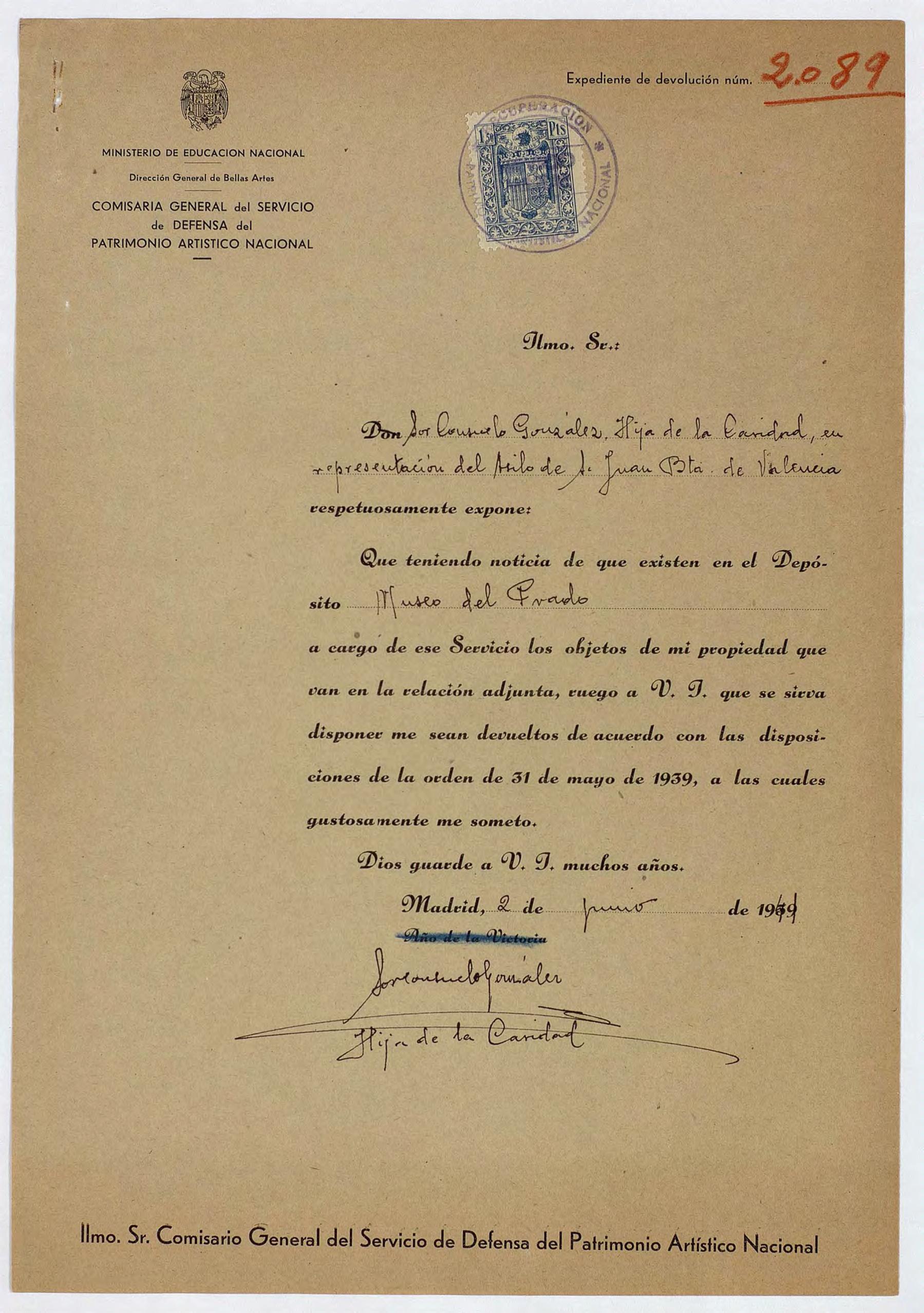 Expediente de devolución del Asilo de San Juan Bautista de Valencia