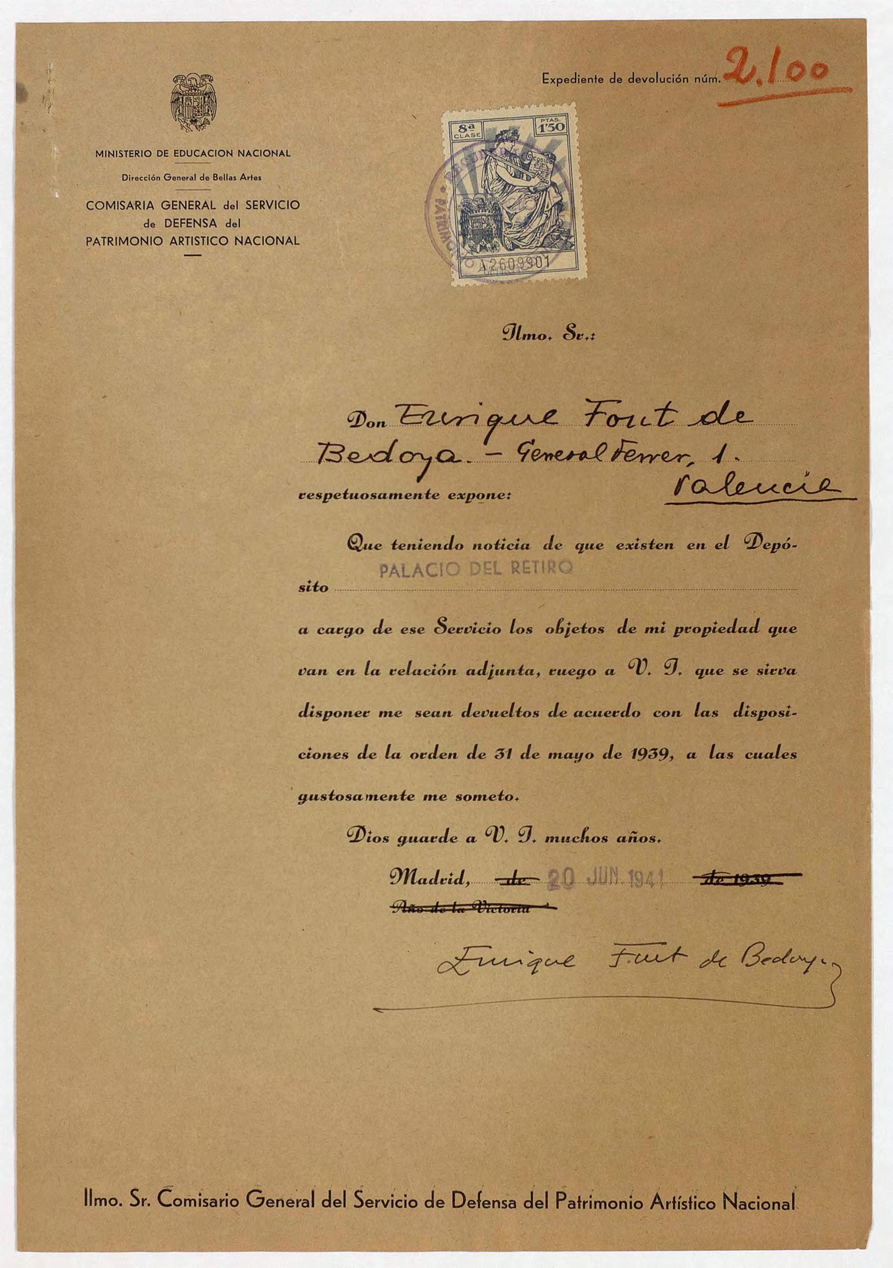 Expediente de devolución de Enrique Font de Bedoya
