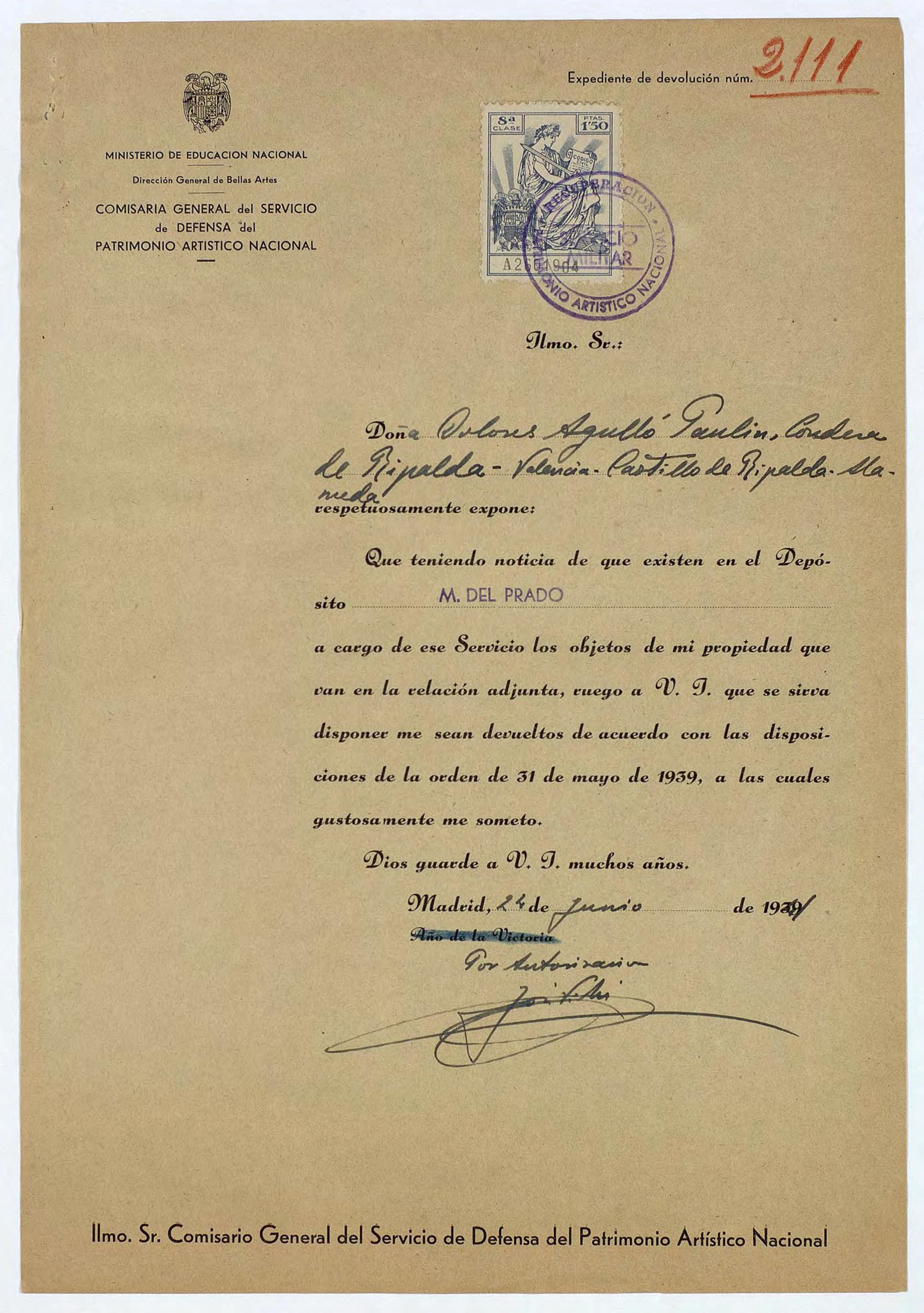 Expediente de devolución de Dolores Agulló Paulín, condesa de Ripalda