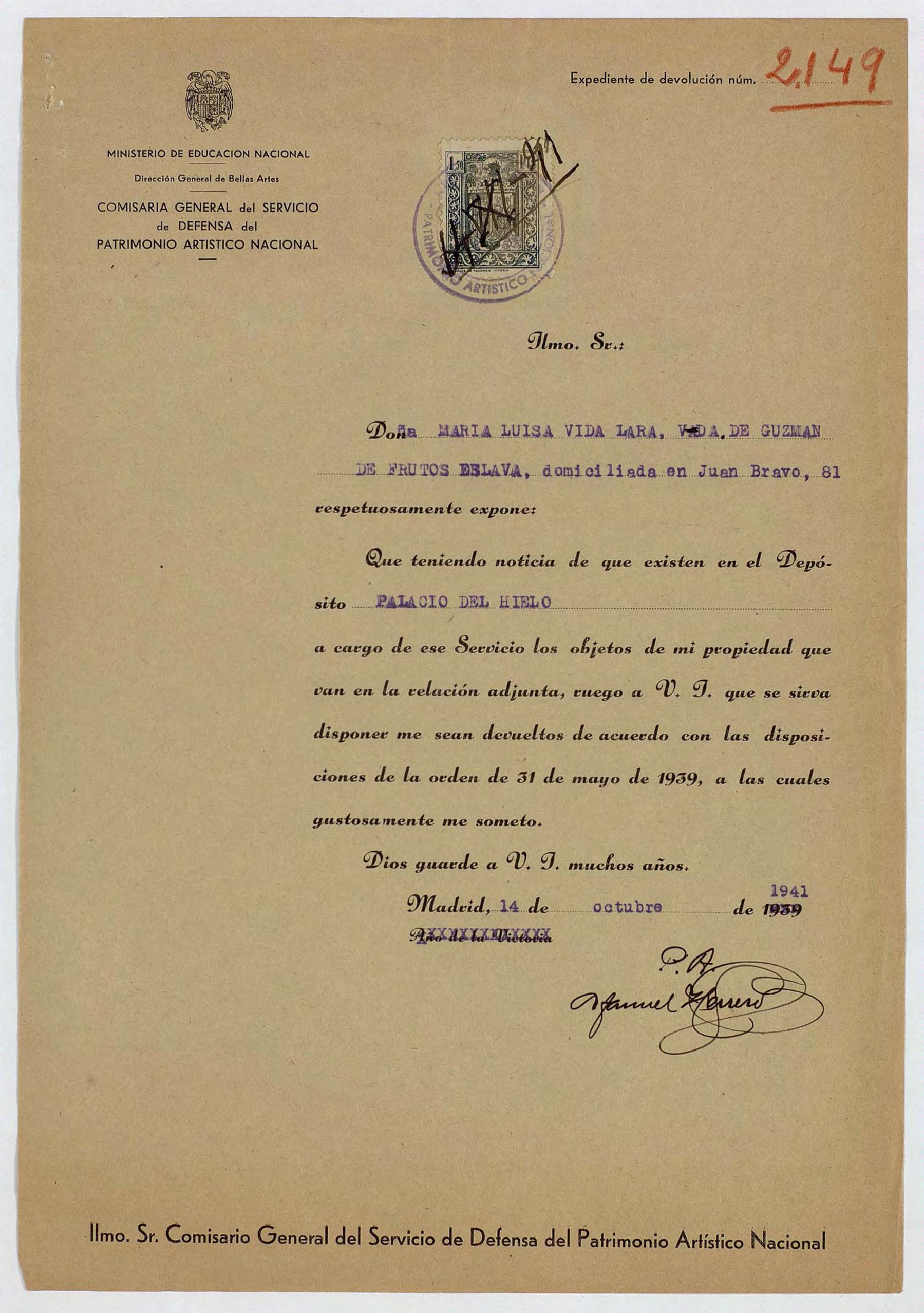 Expediente de devolución de María Luisa Vida Lara, viuda de Guzmán de Frutos Eslava