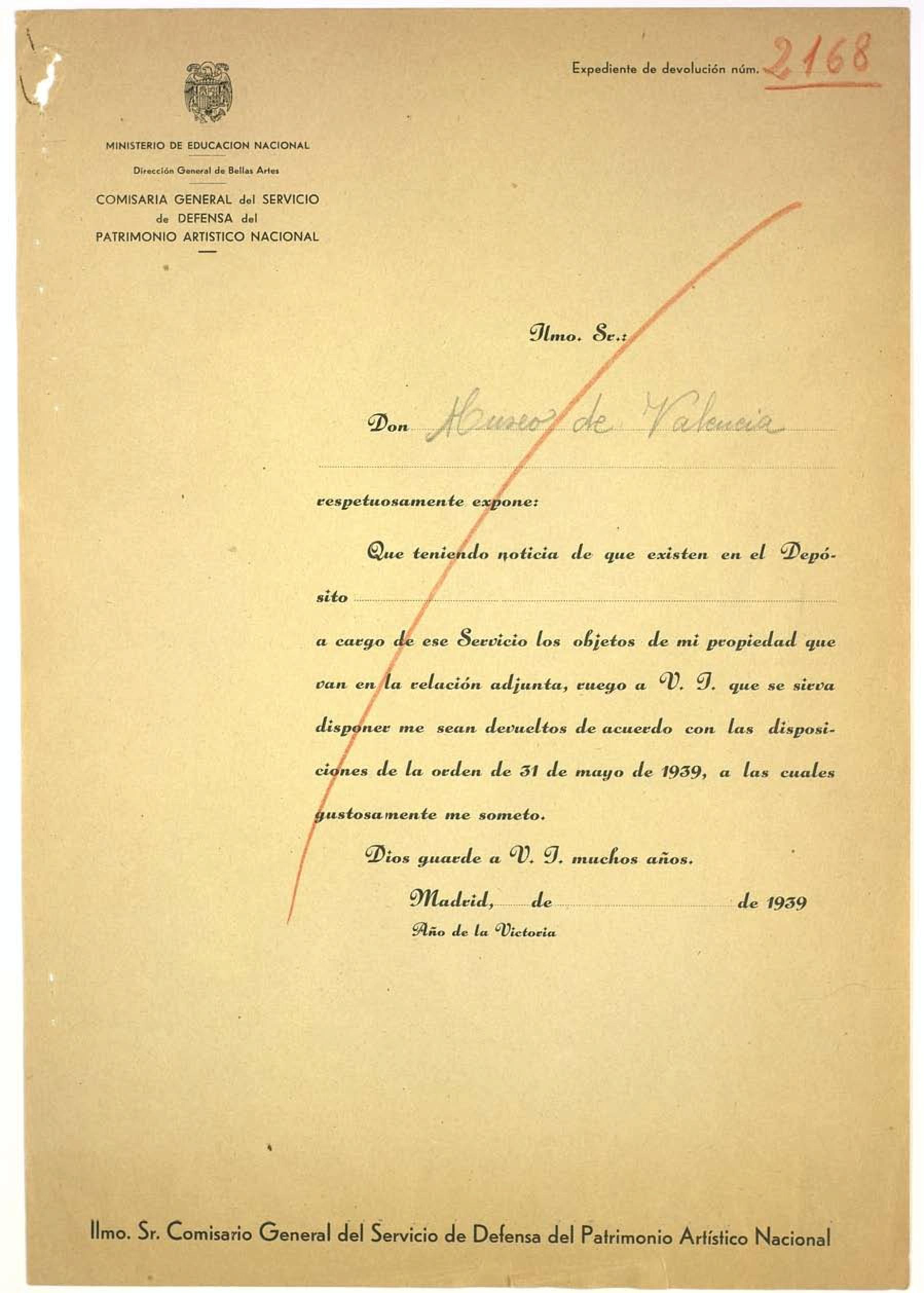 Expediente de devolución del Museo Provincial de Bellas Artes San Carlos de Valencia