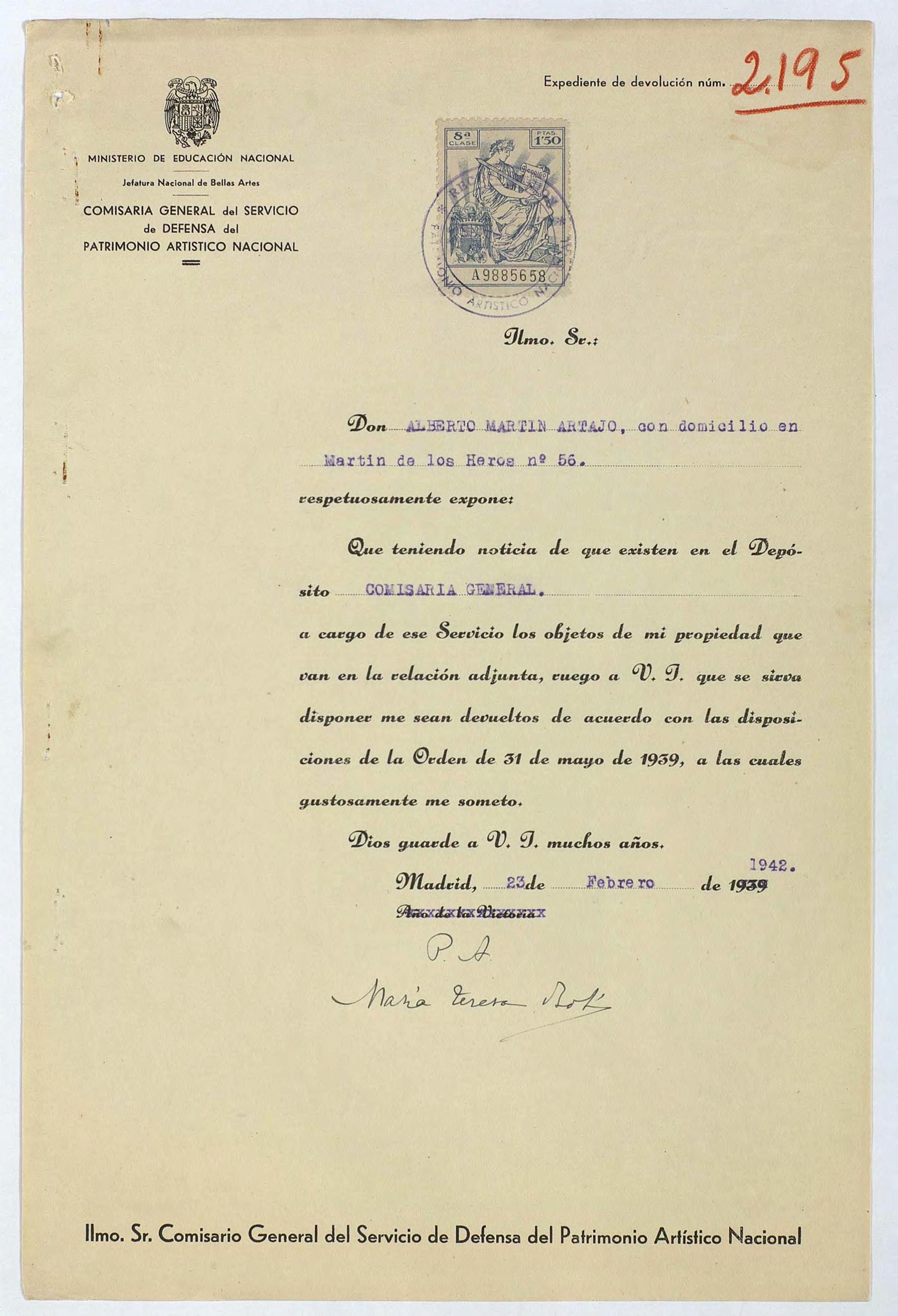 Expediente de devolución de Alberto Martín Artajo