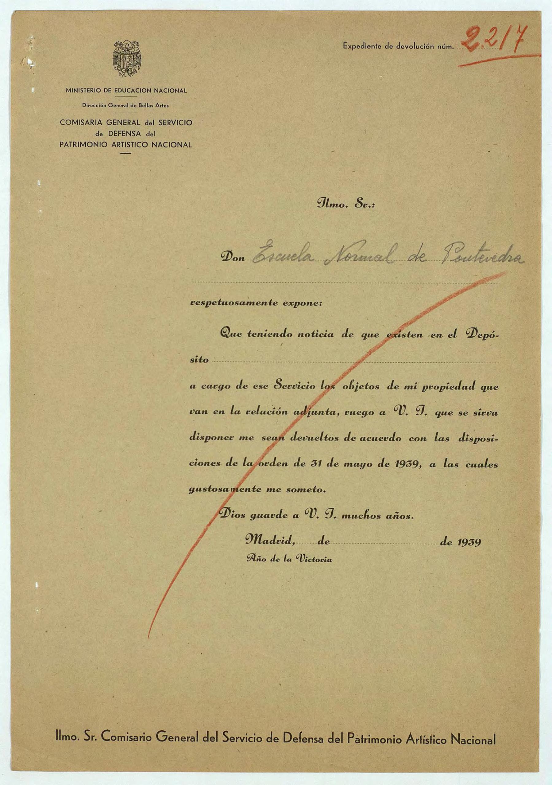 Expediente de devolución de la Escuela Normal del Magisterio Primario de Pontevedra