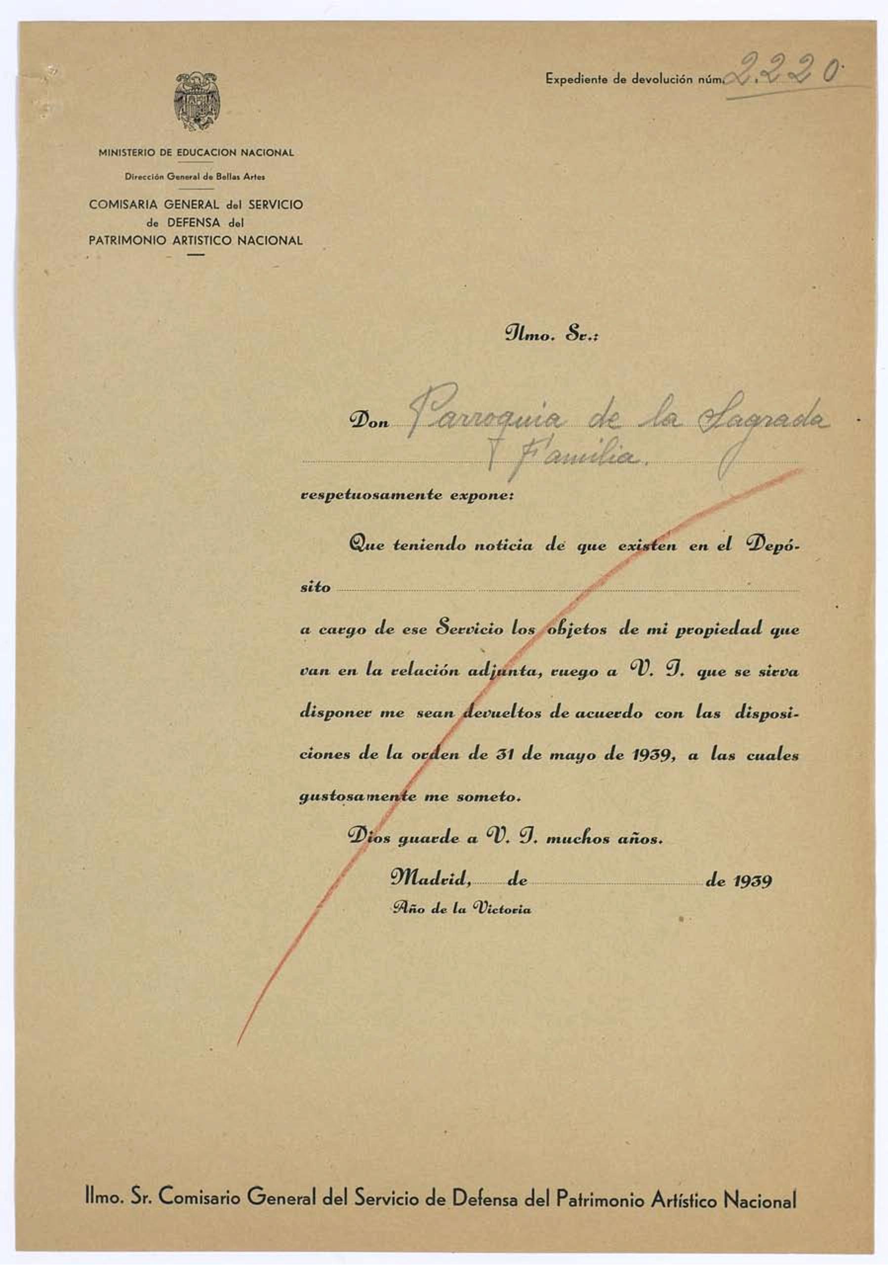 Expediente de devolución del Convento de las Religiosas de la Sagrada Familia de Madrid