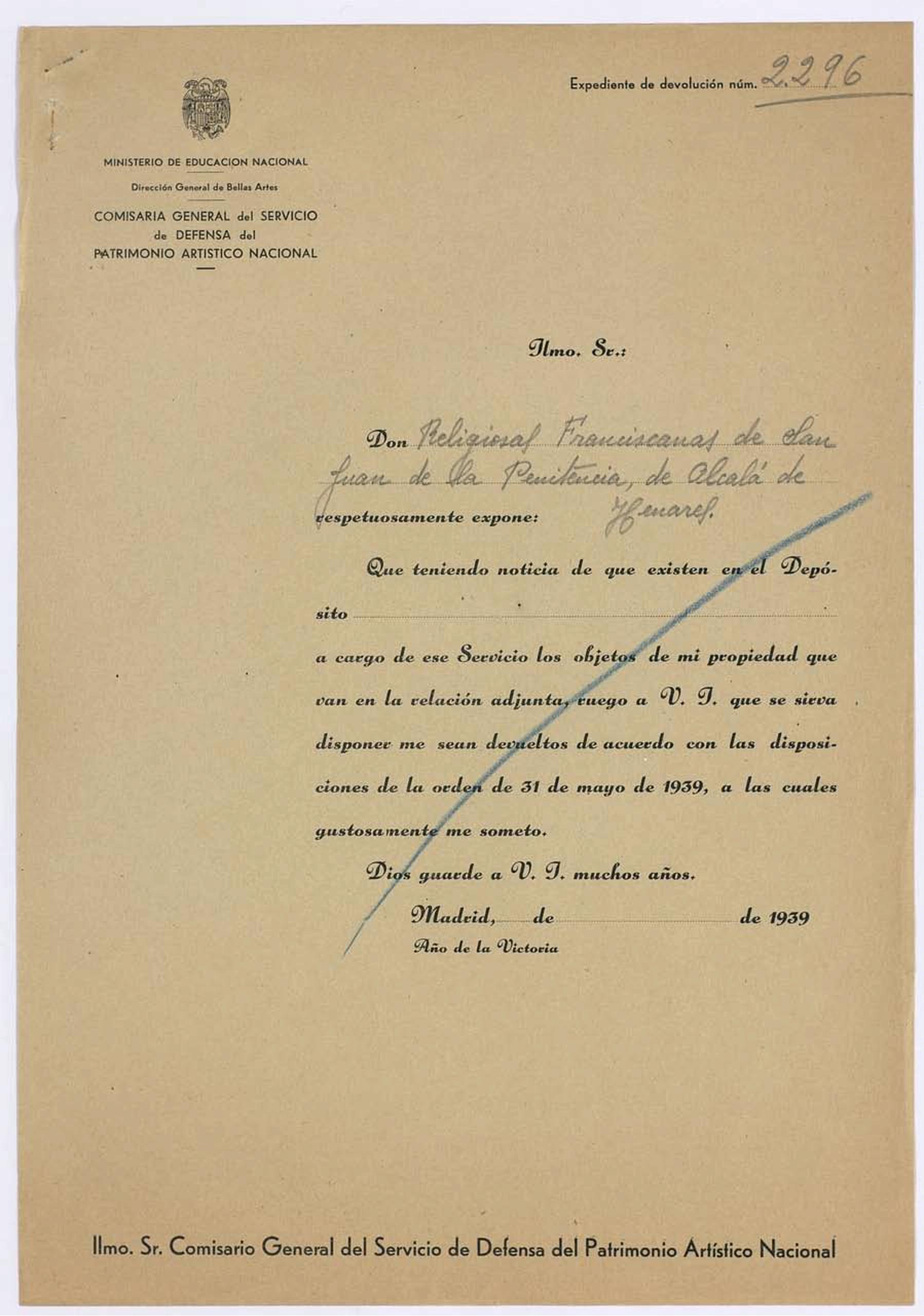 Expediente de devolución del Convento de las Religiosas Franciscanas de San Juan de la Penitencia de Alcalá de Henares (Madrid)