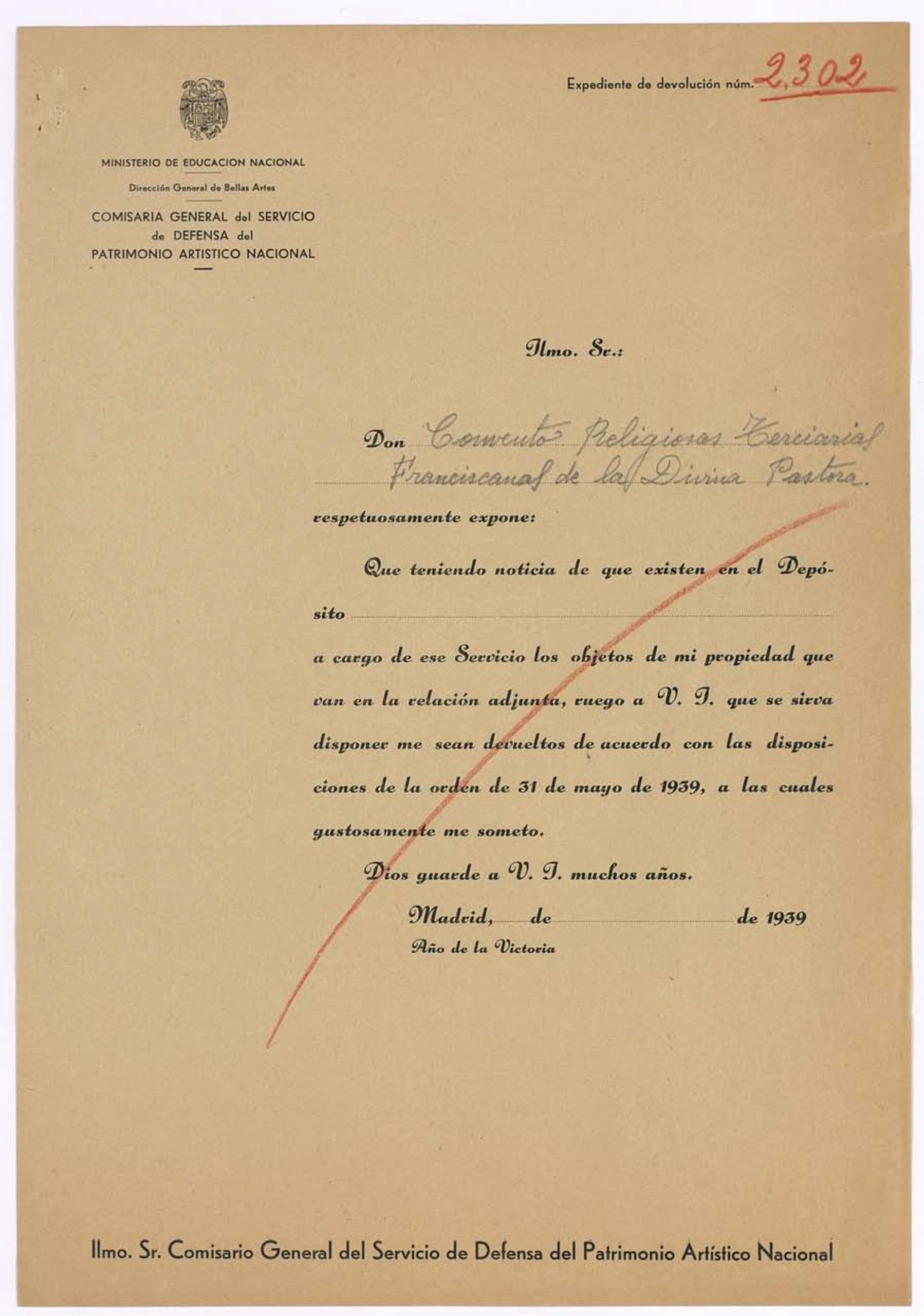 Expediente de devolución del Convento de Religiosas Terciarias Franciscanas de la Divina Pastora del Puente de Vallecas (Madrid)