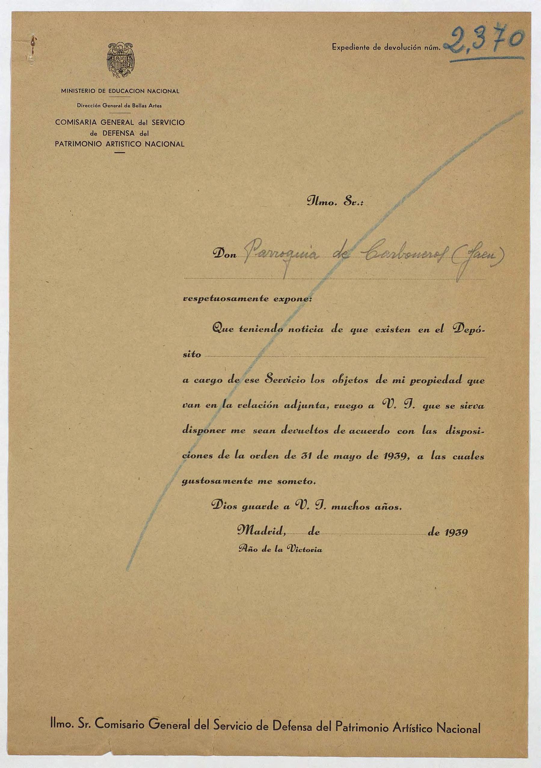 Expediente de devolución de la Parroquia de Carboneros (Jaén)