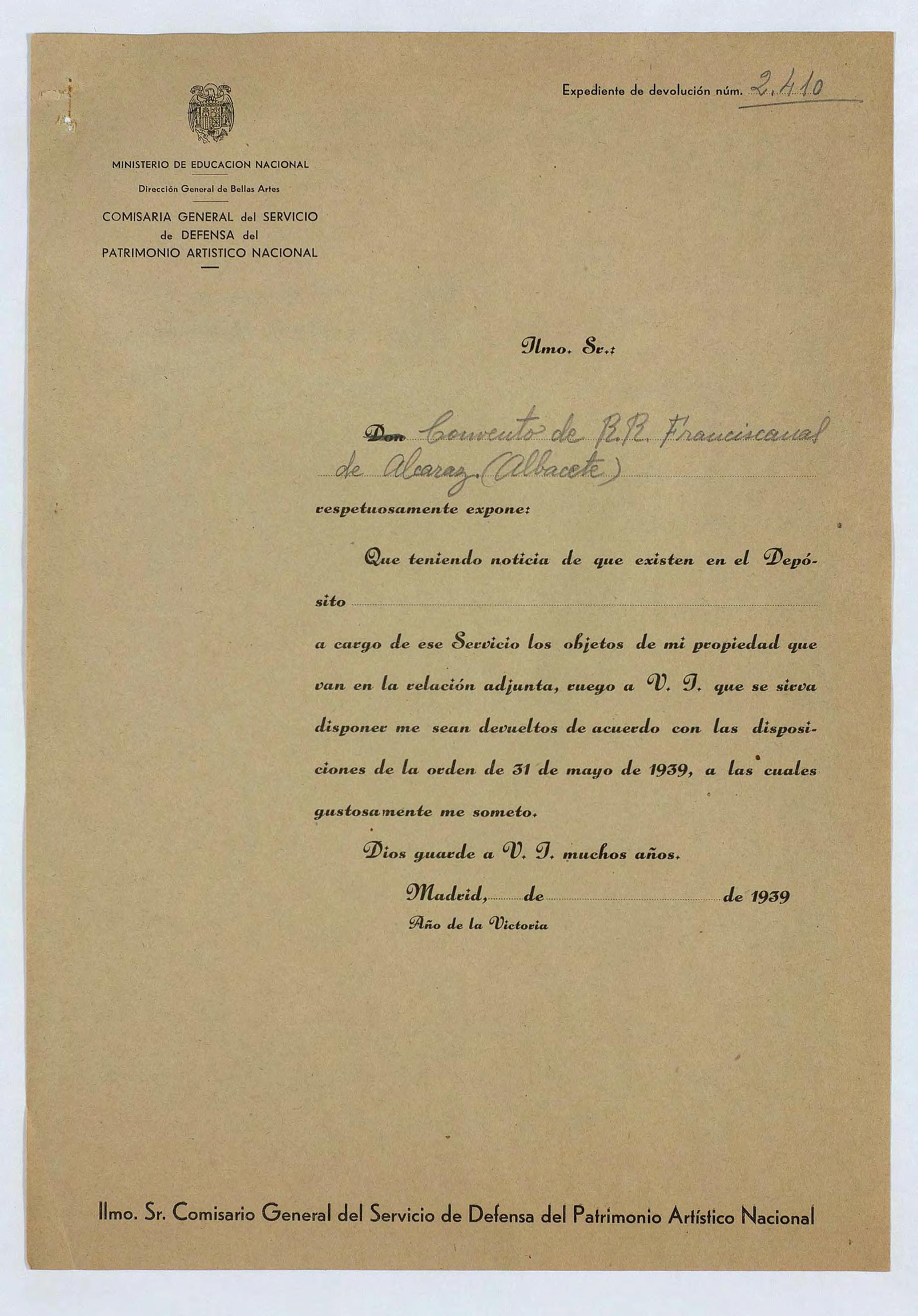 Expediente de devolución del Convento de Religiosas Franciscanas de Alcaraz (Albacete)