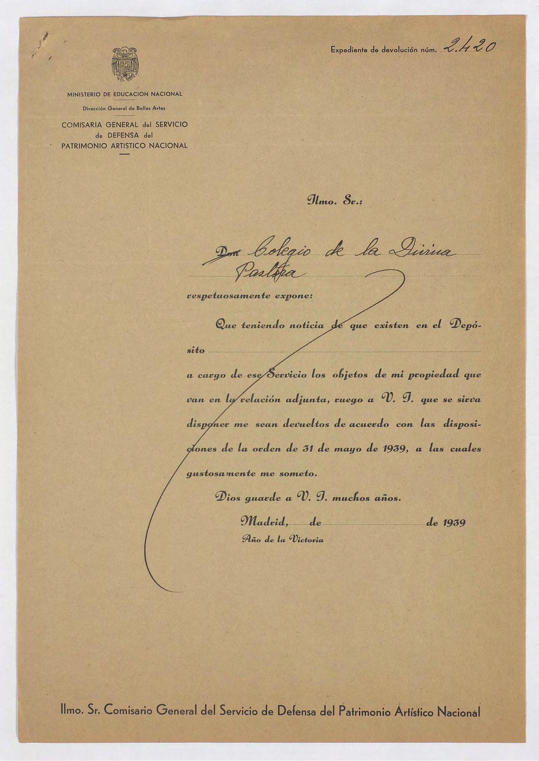 Expediente de devolución del Colegio de la Divina Pastora de Madrid