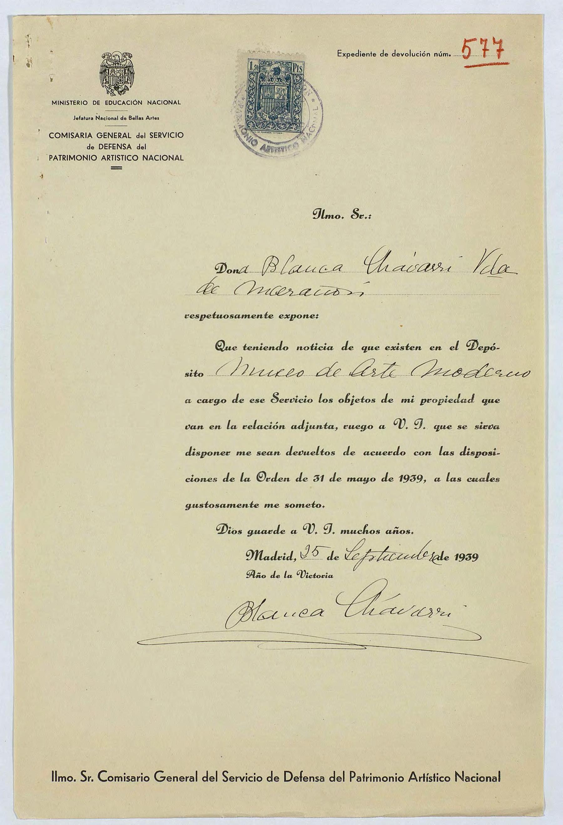Expediente de devolución de Blanca Chávarri, viuda de Marañón