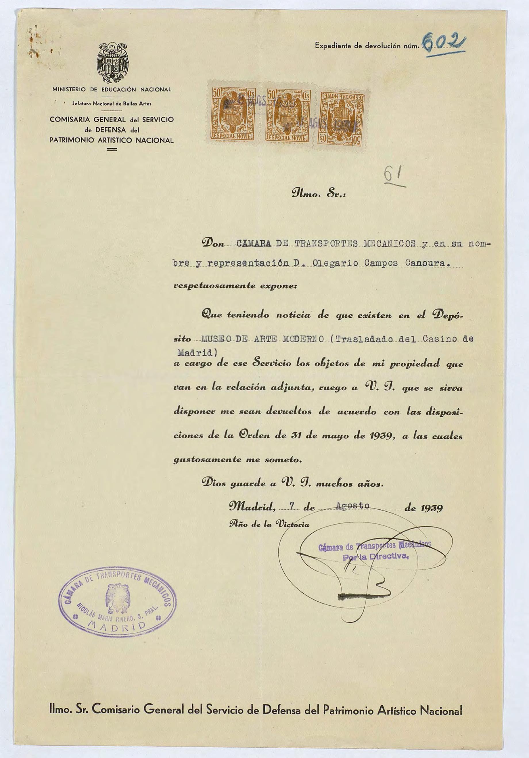 Expediente de devolución de la Cámara de Transportes Mecánicos de Madrid