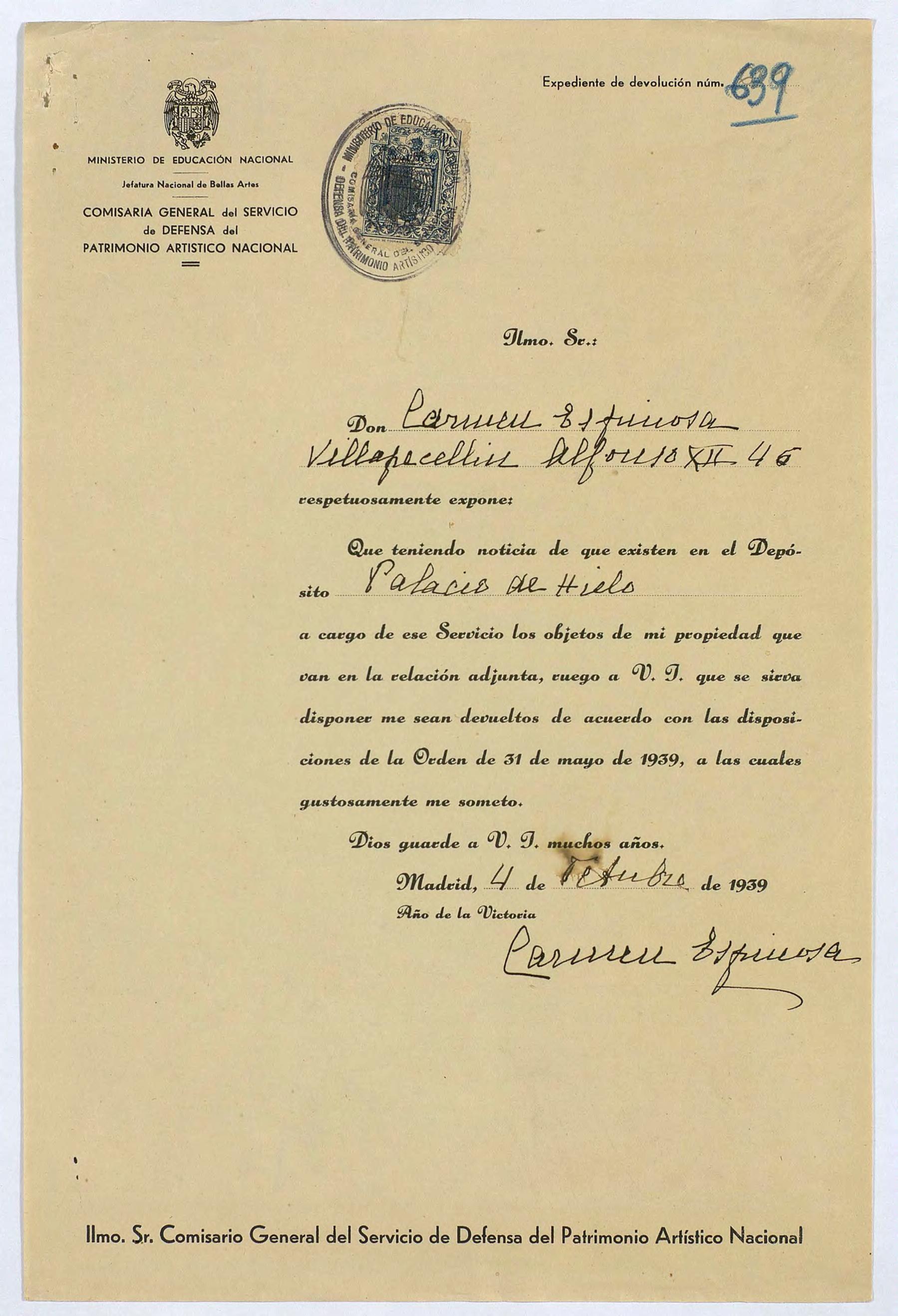 Expediente de devolución de Carmen Espinosa, viuda de Zúñiga