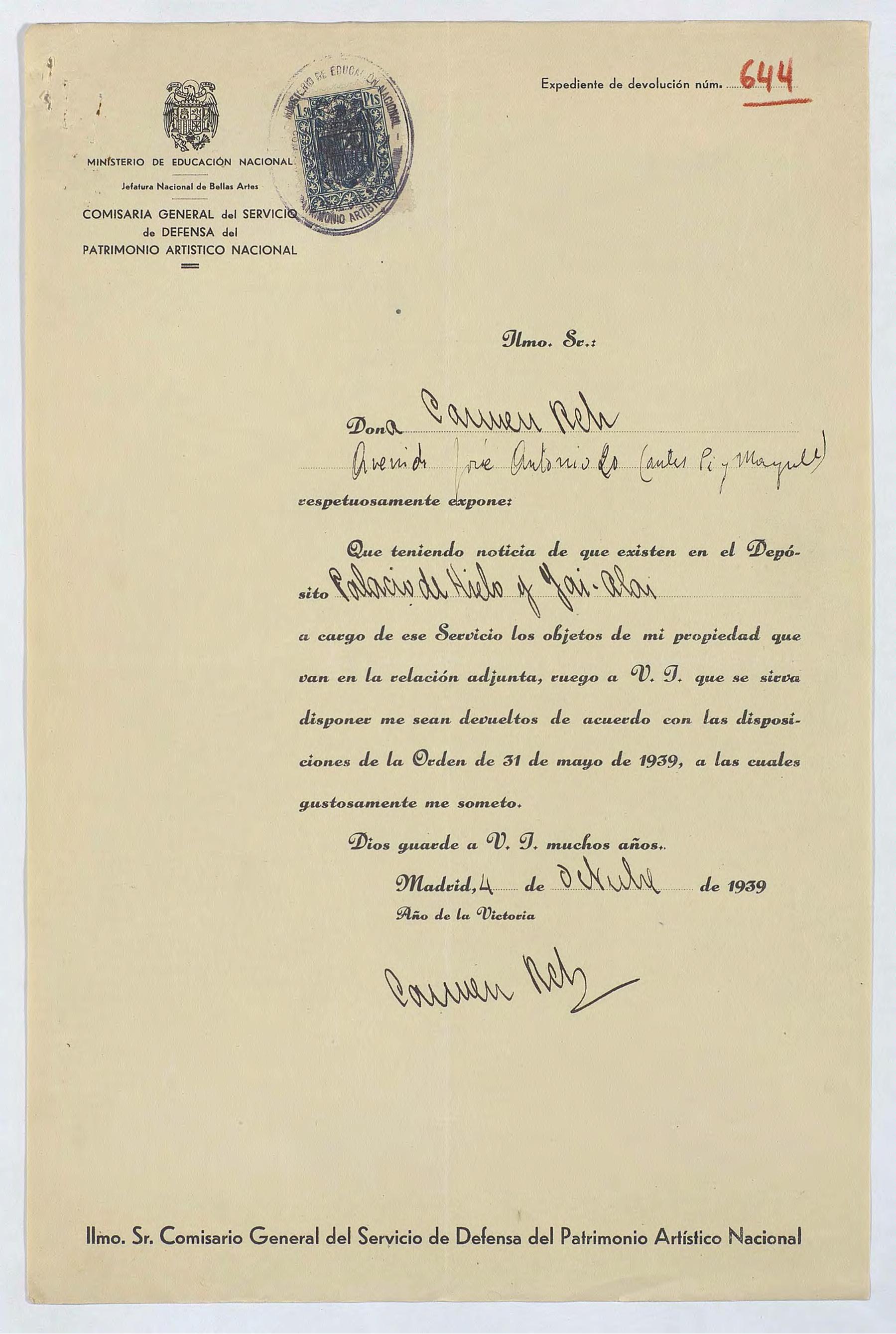 Expediente de devolución de Carmen Reh, viuda de Lorenzi