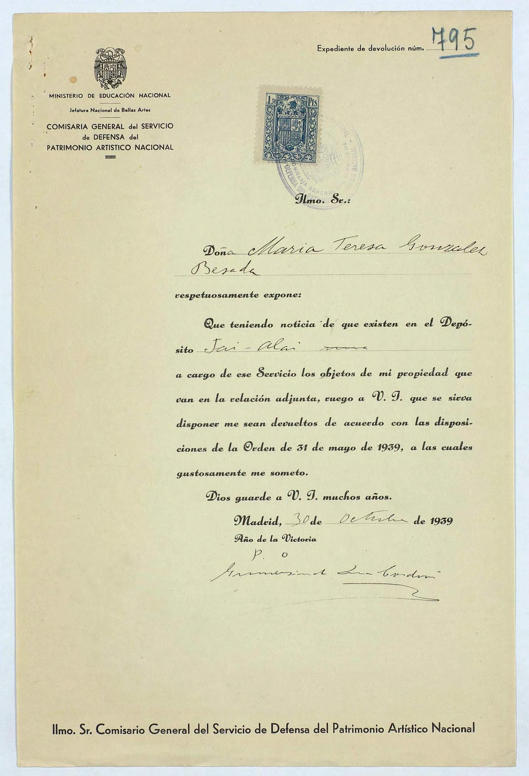 Expediente de devolución de María Teresa González Besada, viuda de Díaz Cordobés