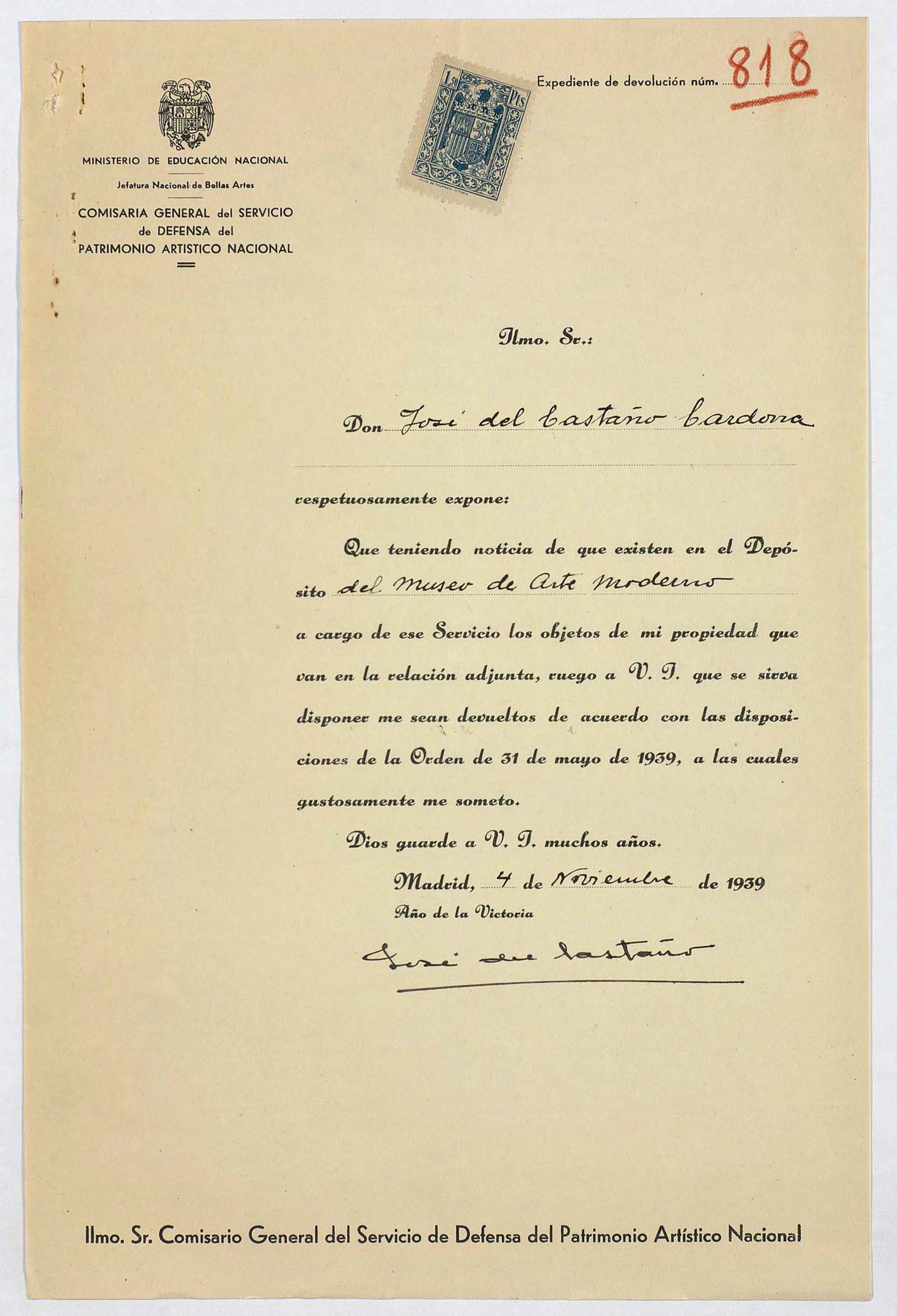 Expediente de devolución de José del Castaño Cardona