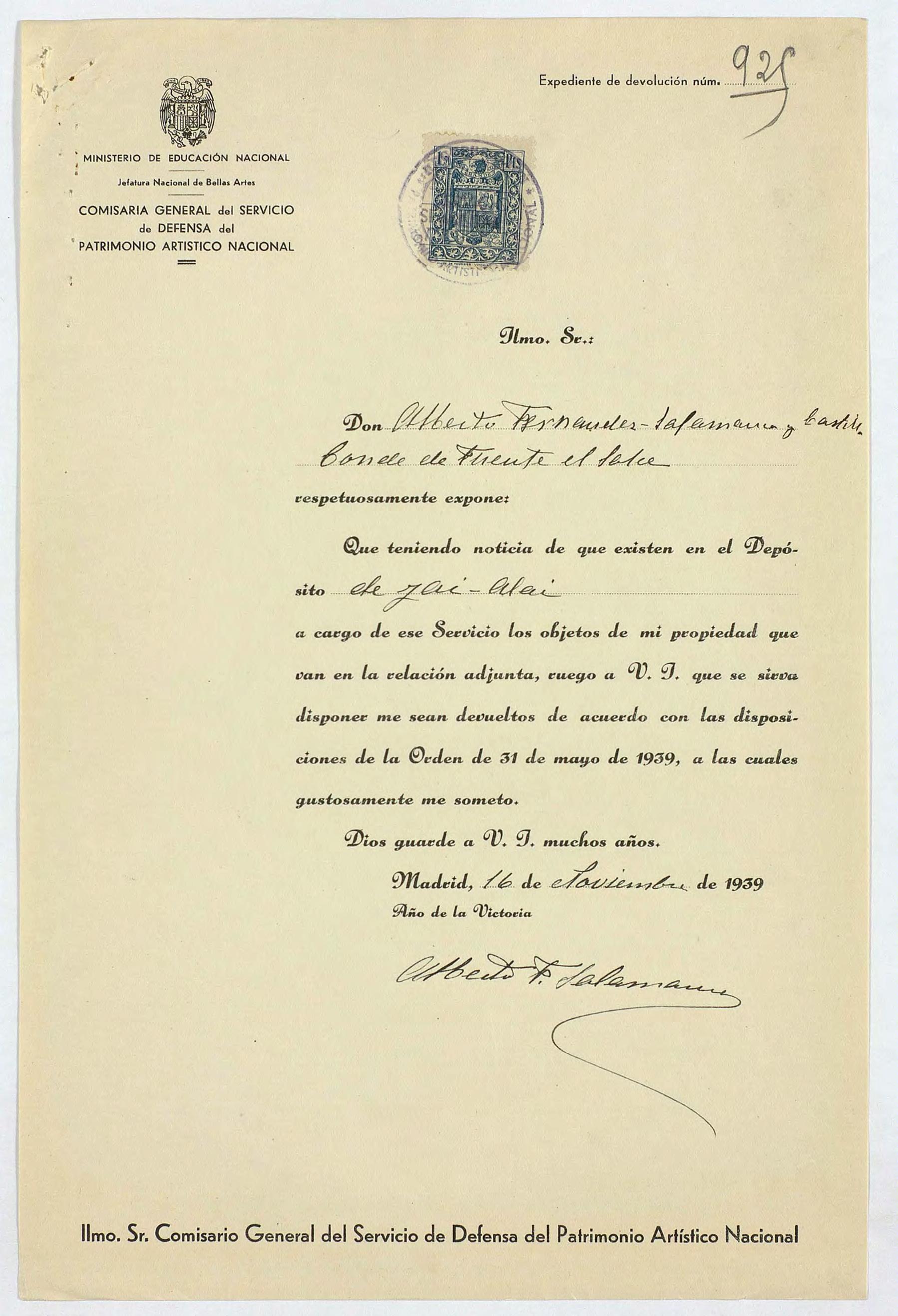 Expediente de devolución de Alberto Fernández de Salamanca y Castilla, conde de Fuente el Salce