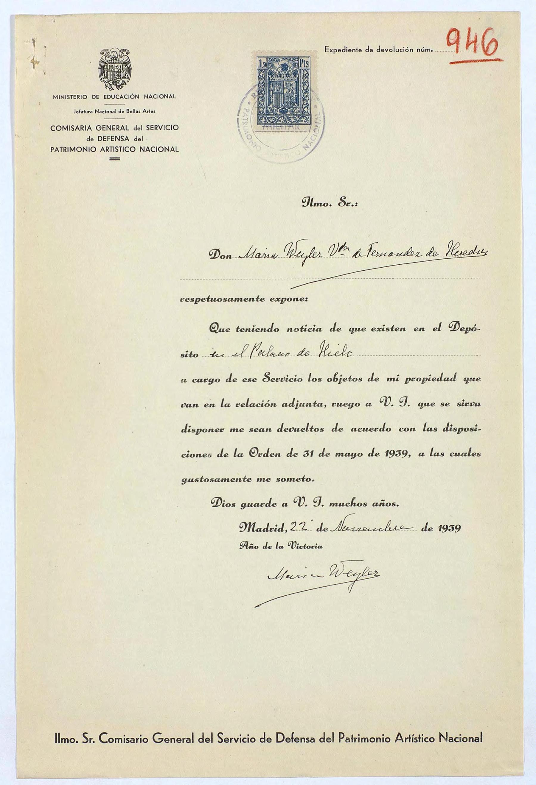 Expediente de devolución de María Weyler, viuda de Fernández de Heredia