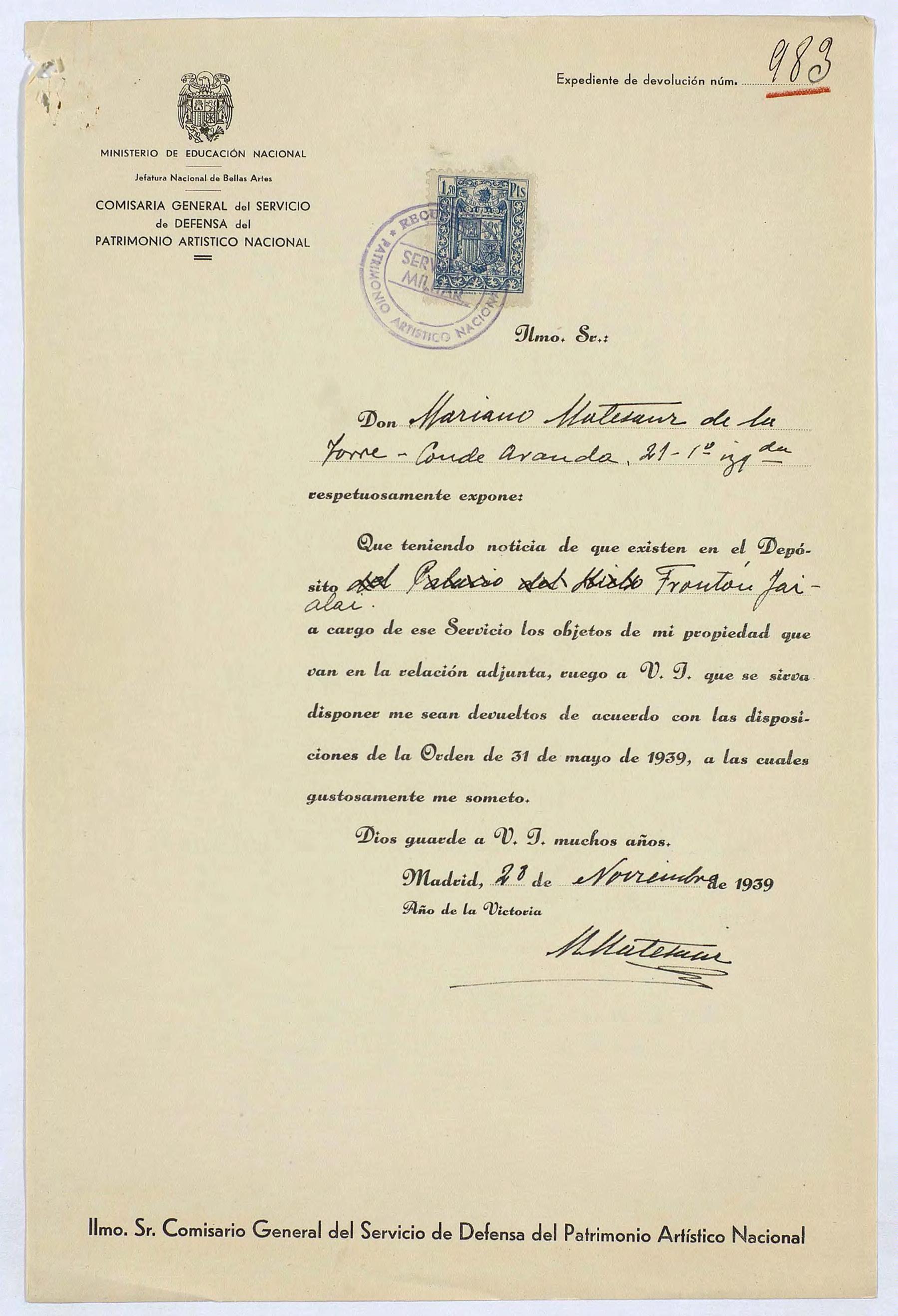 Expediente de devolución de Mariano Matesanz de la Torre