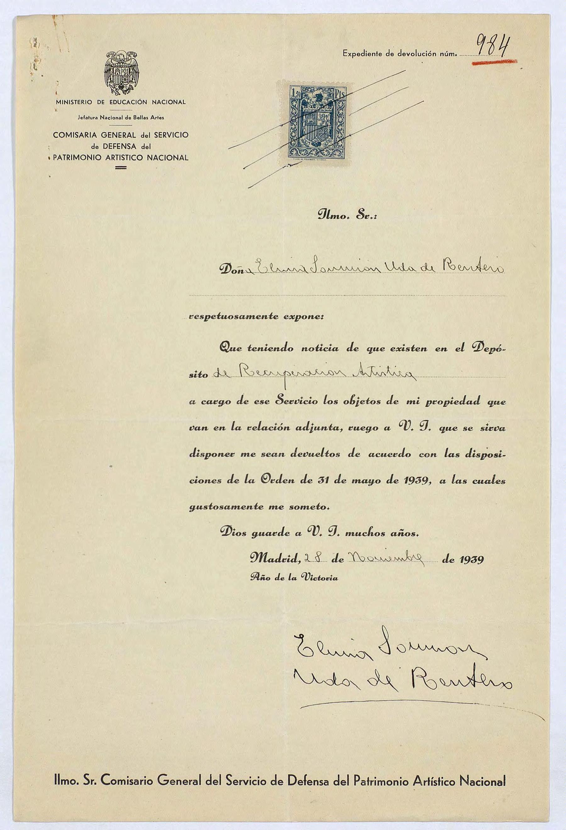 Expediente de devolución de Elvira Souviron, viuda de Rentero