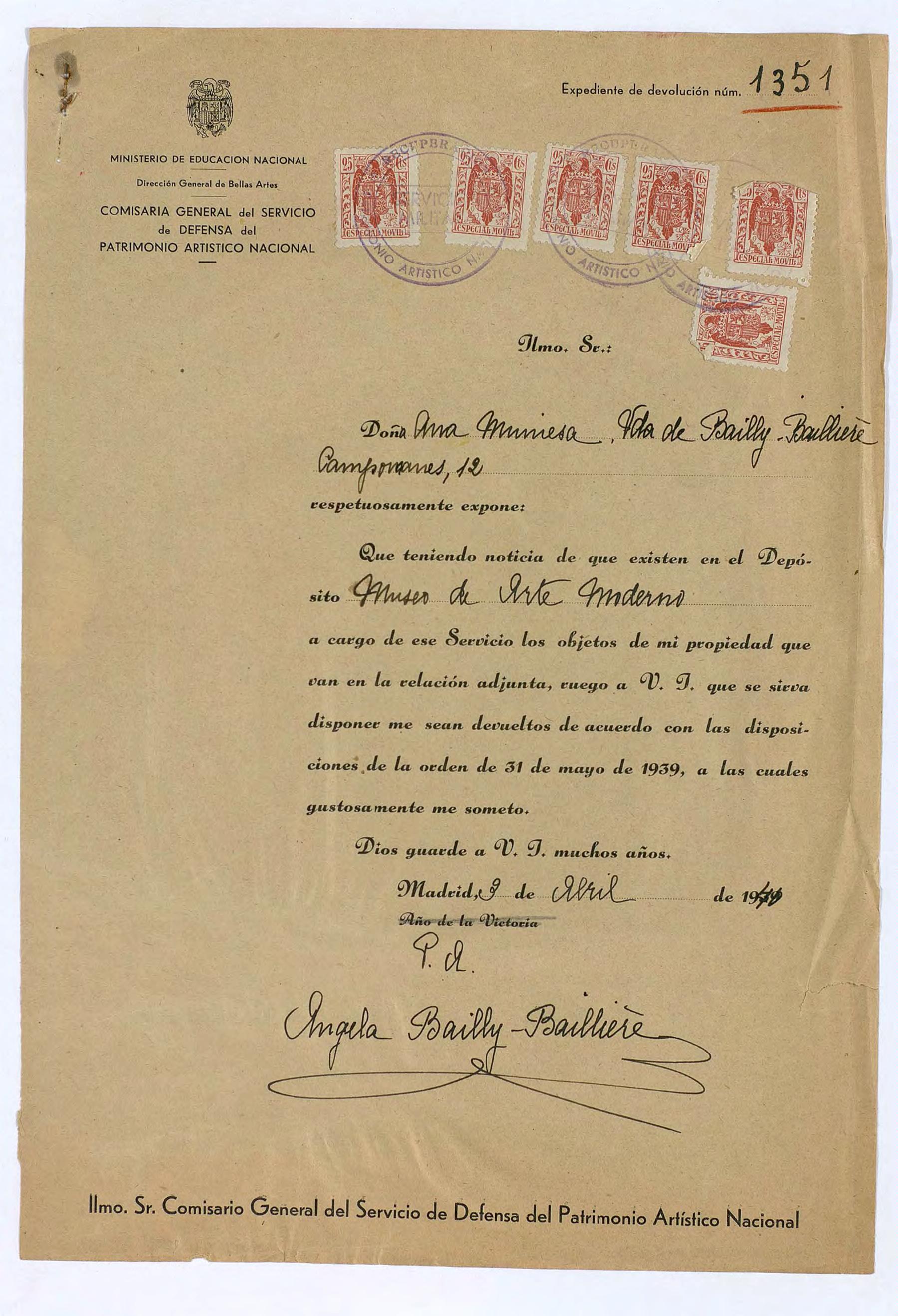 Expediente de devolución de Ana Muniesa, viuda de Bailly-Bailliere