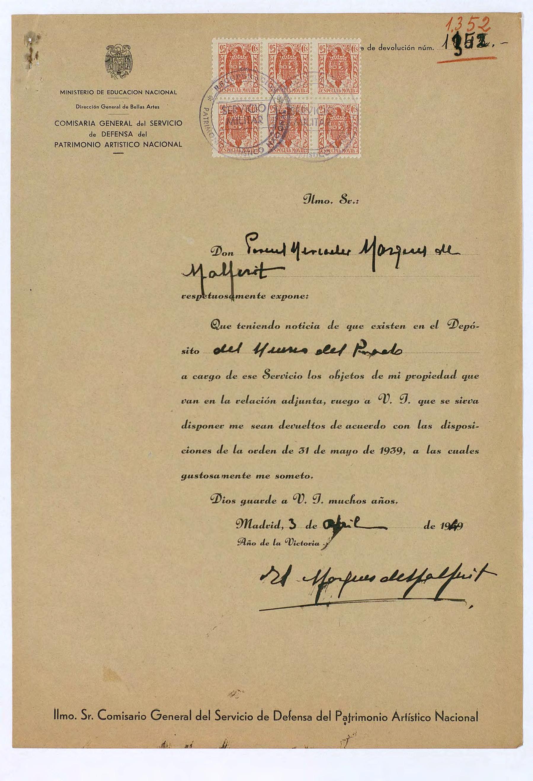Expediente de devolución de Pascual Mercader, marqués de Malferit