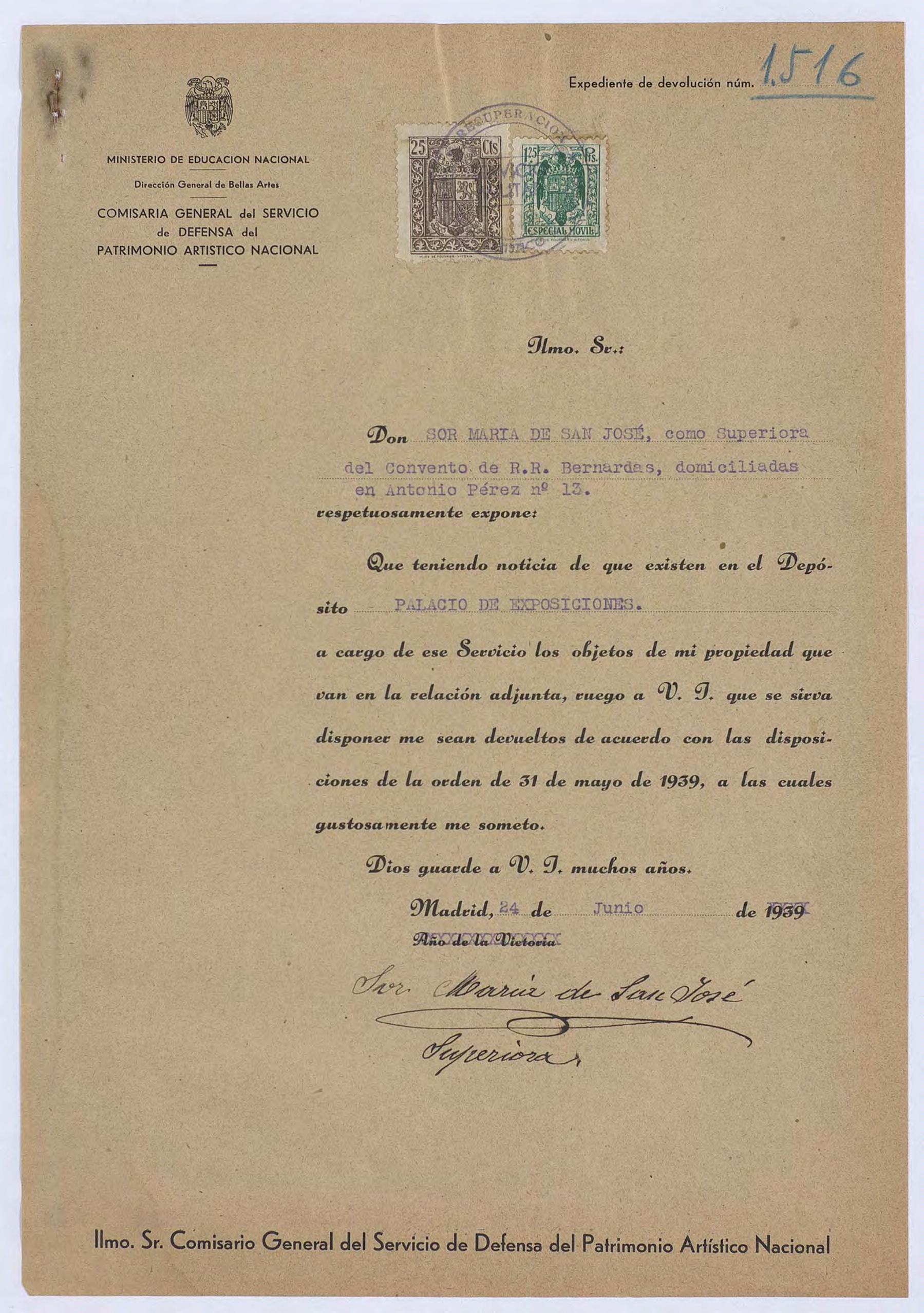 Expediente de devolución del Convento de Religiosas de la Piedad Bernarda (Vallecas)
