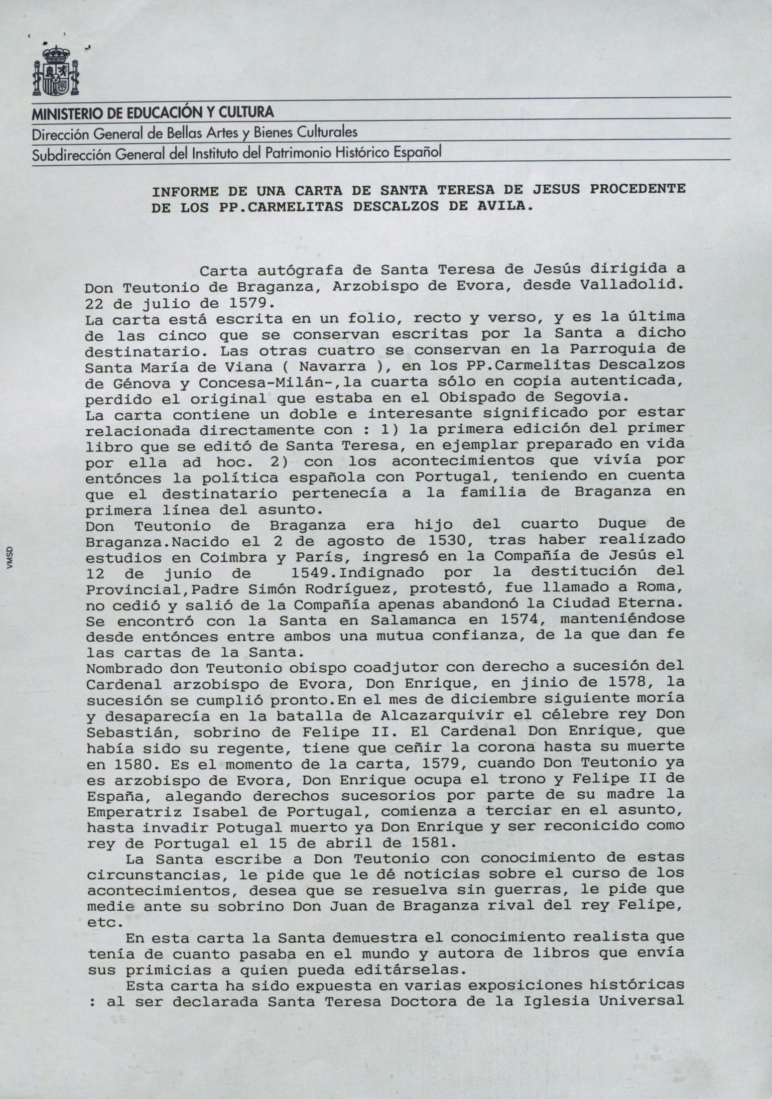 Informe para la conservación de una carta autógrafa de Santa Teresa procedente de los Padres Carmelitas Descalzos de Ávila