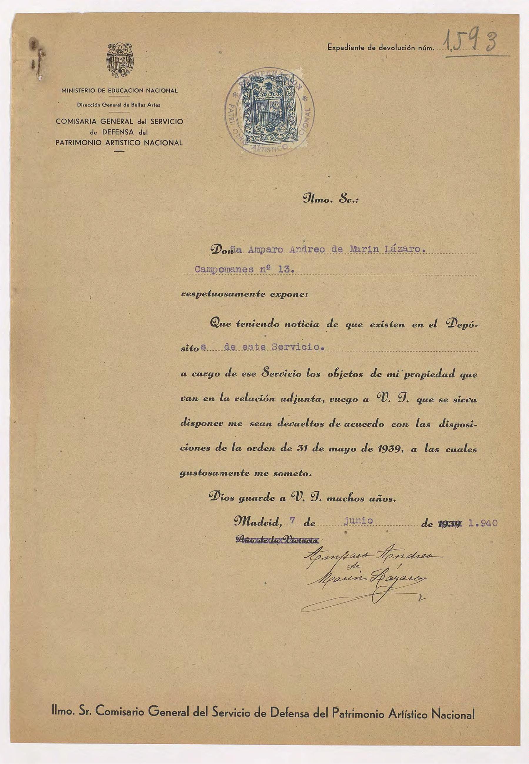 Expediente de devolución de Amparo Andreo de Marín Lázaro