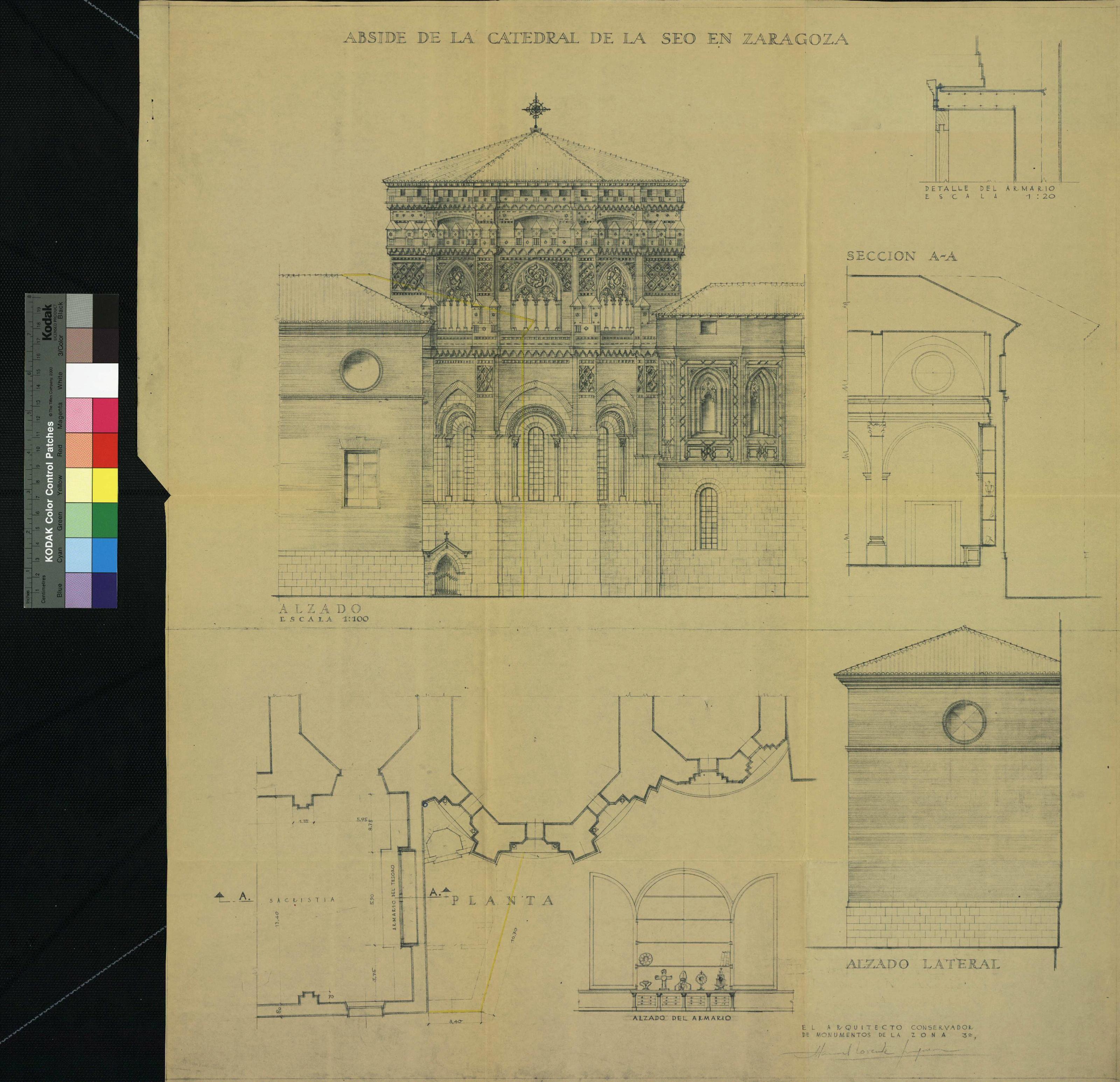 Abside de la Catedral de la Seo en Zaragoza: Planta. Alzado Alzado Lateral. Sección A-A' Alzado del Armario. Detalle del armario