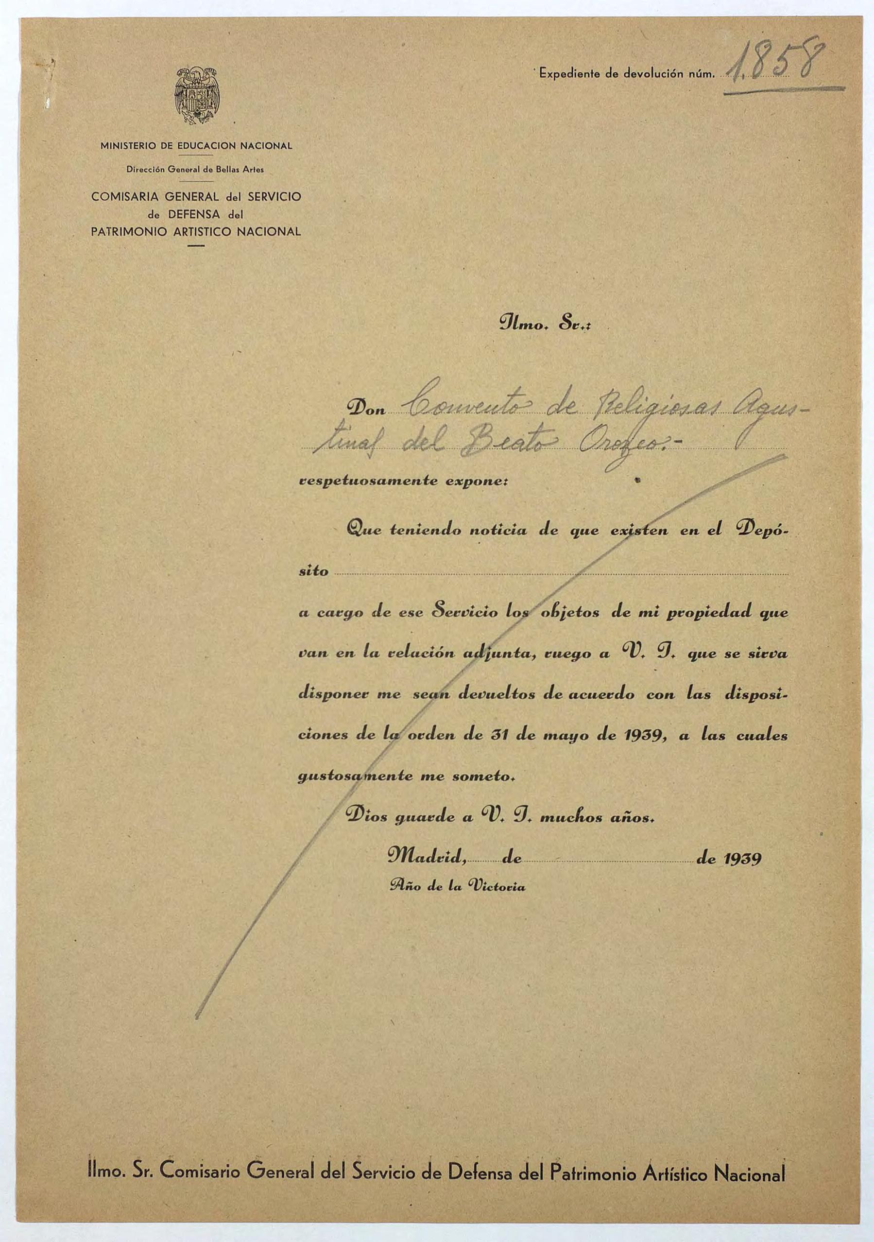 Expediente de devolución del Convento de Religiosas Agustinas del Beato Orozco de Madrid