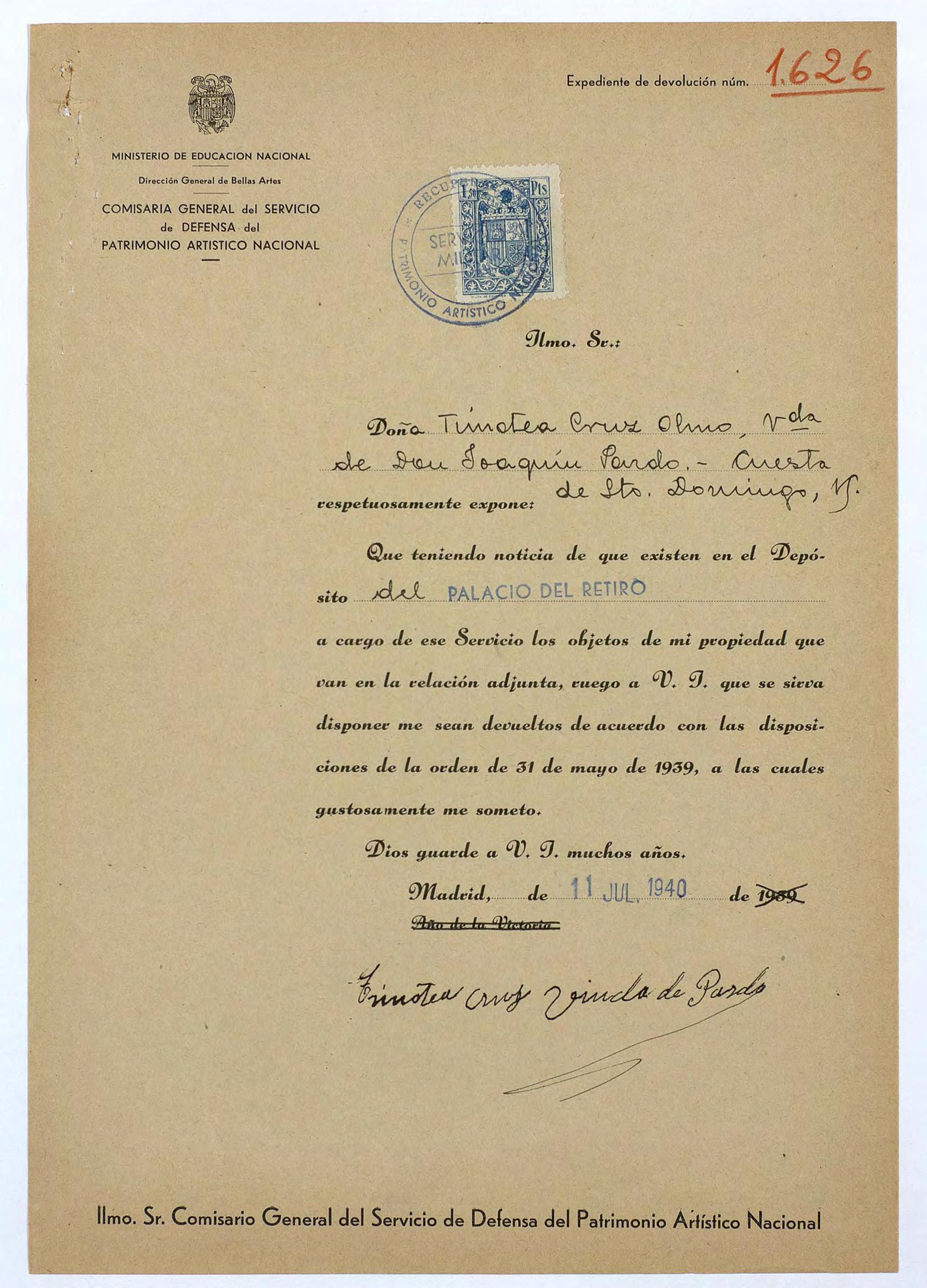 Expediente de devolución de Timotea Cruz Olmo, viuda de Joaquín Pardo